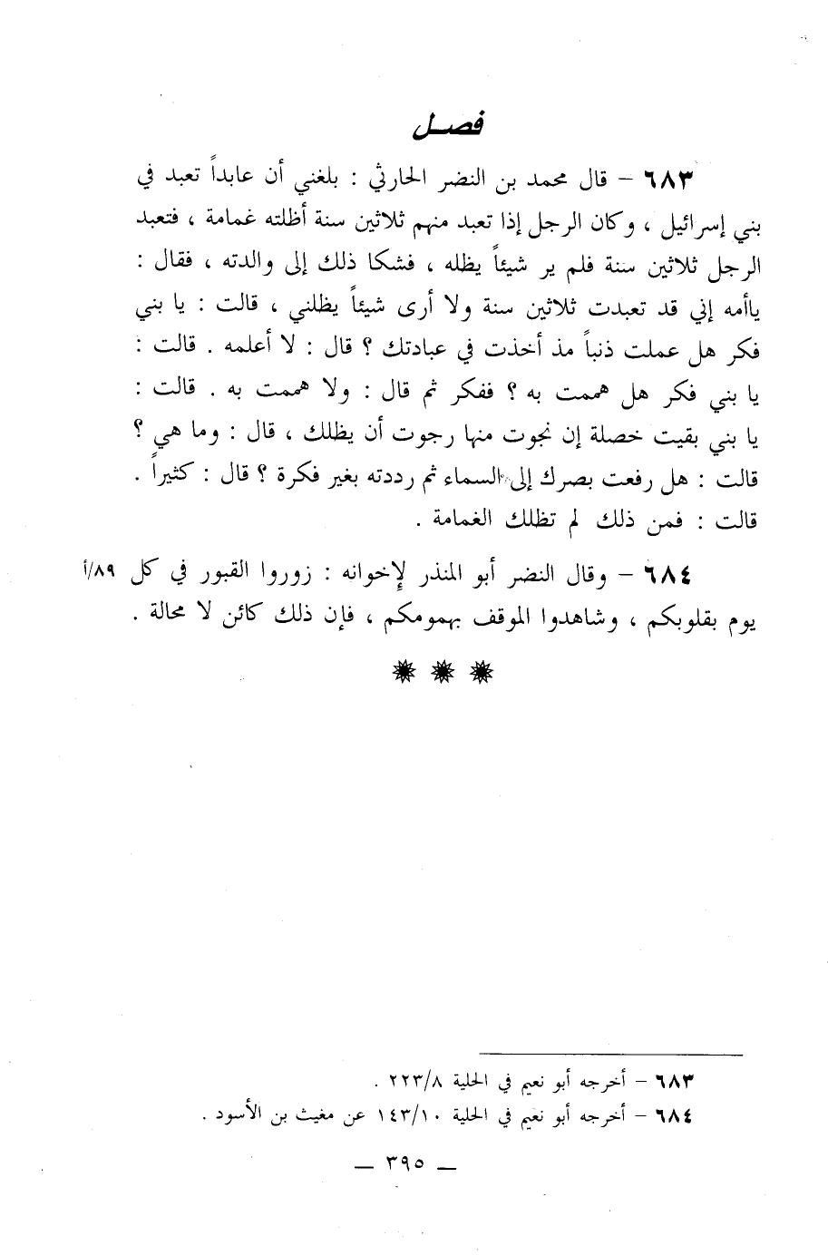 683- قال محمد بن النضر الحارثي: بلغني أن عابداً تعبد في بني إسرائيل، وكان الرجل إذا تعبد منهم ثلاثين سنة أظلته غمامة، فتعبد الرجل ثلاثين سنة فلم ير شيئاً يظله، فشكا ذلك إلى والدته، فقال: يا أمه إني قد تعبدت ثلاثين سنة ولا أرى شيئاً يظلني، قالت: يا بني فكر هل عملت ذنباً مذ أخذت في عبادتك؟ قال: لا أعلمه. قالت: يا بني فكر هل هممت به؟ ففكر ثم قال: ولا هممت به. قالت: يا بني بقيت خصلة إن نجوت منها رجوت أن يظلك، قال: وما هي؟ قالت: هل رفعت بصرك إلى السماء ثم رددته بغير فكرة؟ قال: كثيراً قالت: فمن ذلك لم تظلك الغمامة.