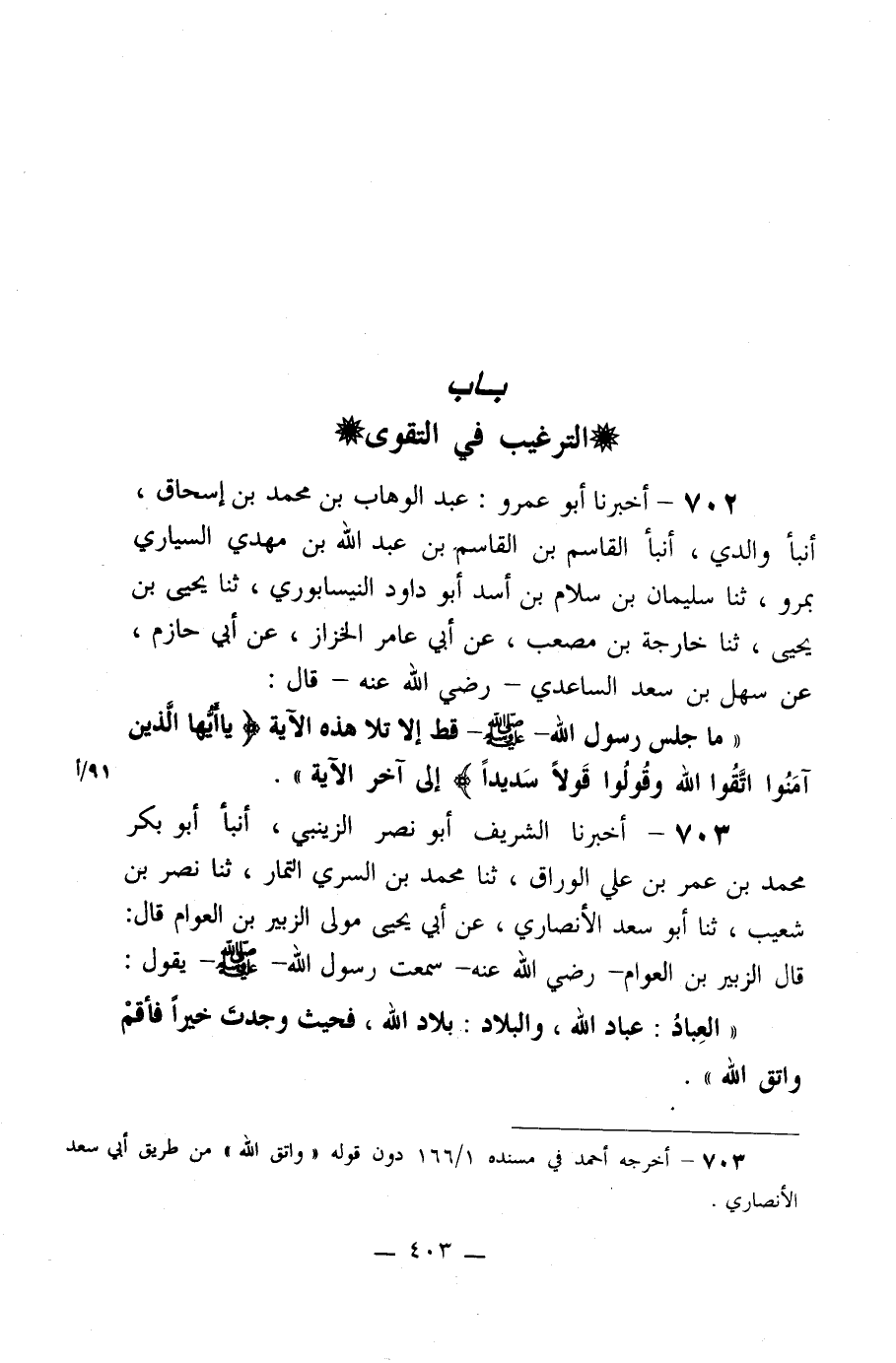 703- أخبرنا الشريف أبو نصر الزينبي، أنبأ أبو بكر محمد بن عمر بن علي الوراق، ثنا محمد بن السري التمار، ثنا نصر بن شعيب، ثنا أبو سعد الأنصاري، عن أبي يحيى مولى الزبير بن العوام قال: قال الزبير بن العوام –رضي الله عنه-: سمعت رسول الله صلى الله عليه وسلم يقول: