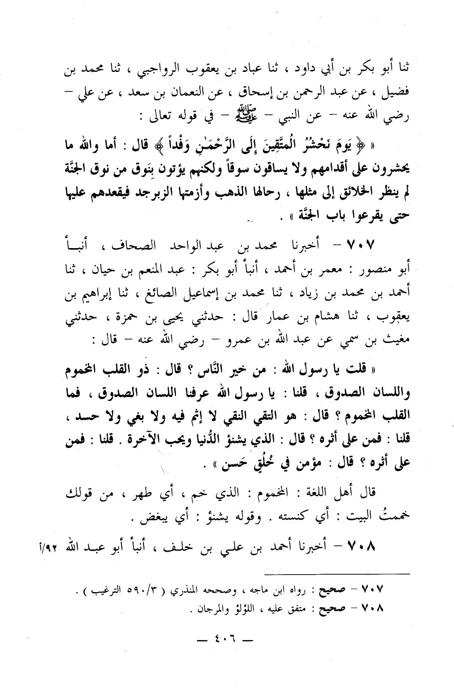 ((قلت يا رسول الله: من خير الناس؟ قال: ذو القلب المخموم واللسان الصدوق، قلنا: يا رسول الله عرفنا اللسان الصدوق، فما القلب المخموم؟ قال: هو التقي النقي لا إثم فيه ولا بغي ولا حسد، قلنا: فمن على أثره؟ قال: الذي يشنؤ الدنيا ويحب الآخرة. قلنا: فمن على أثره؟ قال: مؤمن في خلق حسن)) .