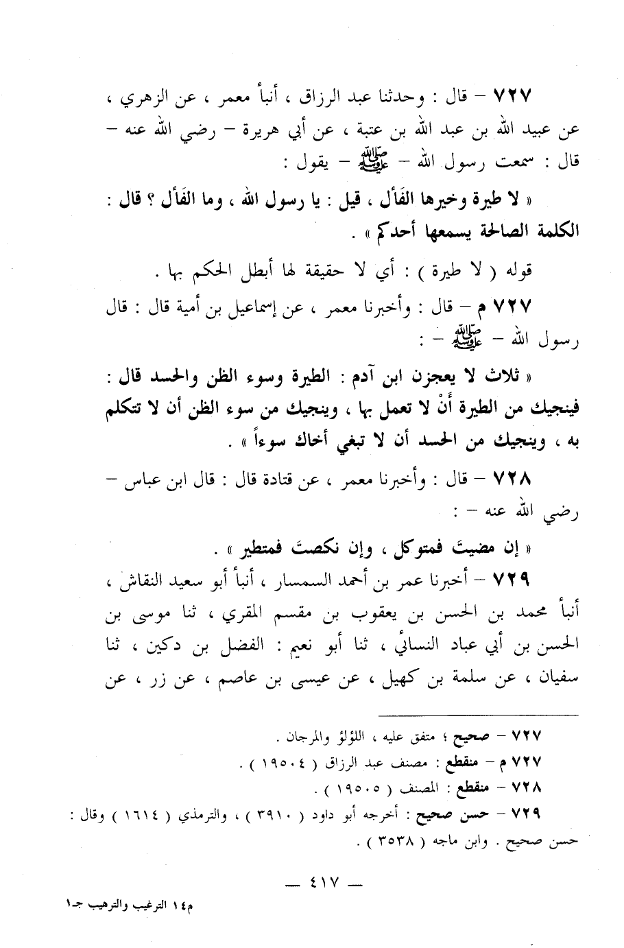 727- قال: وحدثنا عبد الرزاق، أنبأ معمر، عن الزهري، عن عبيد الله بن عبد الله بن عتبة، عن أبي هريرة –رضي الله عنه- قال: سمعت رسول الله صلى الله عليه وسلم يقول:
