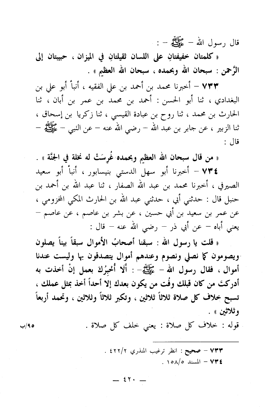 ((قلت يا رسول الله: سبقنا أصحاب الأموال سبقاً بيناً يصلون ويصومون كما نصلي ونصوم وعندهم أموال يتصدقون بها وليست عندنا أموال، فقال رسول الله صلى الله عليه وسلم: ألا أخبرك بعمل إن أخذت به أدركت من كان قبلك وفت من يكون بعدك إلا أحداً أخذ بمثل عملك، تسبح خلاف كل صلاة ثلاثاً وثلاثين، وتكبر ثلاثاً وثلاثين، وتحمد أربعاً وثلاثين)) .