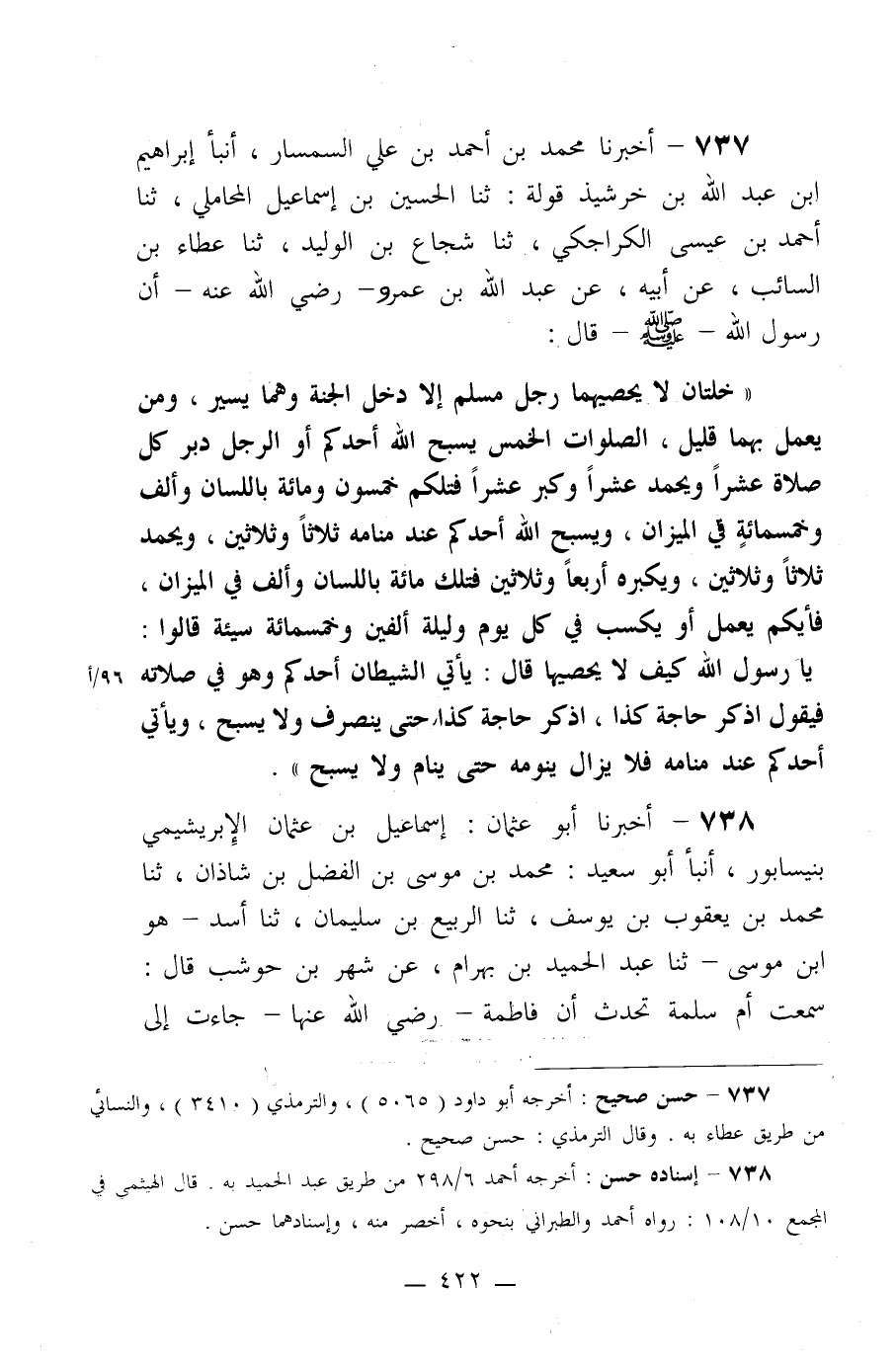737- أخبرنا محمد بن أحمد بن علي السمسار، أنبأ إبراهيم بن عبد الله بن خرشيذ قولة: ثنا الحسين بن إسماعيل المحاملي، ثنا أحمد بن عيسى الكراجكي، ثنا شجاع بن الوليد، ثنا عطاء بن السائب، عن أبيه، عن عبد الله بن عمر –رضي الله عنه- أن رسول الله صلى الله عليه وسلم قال: