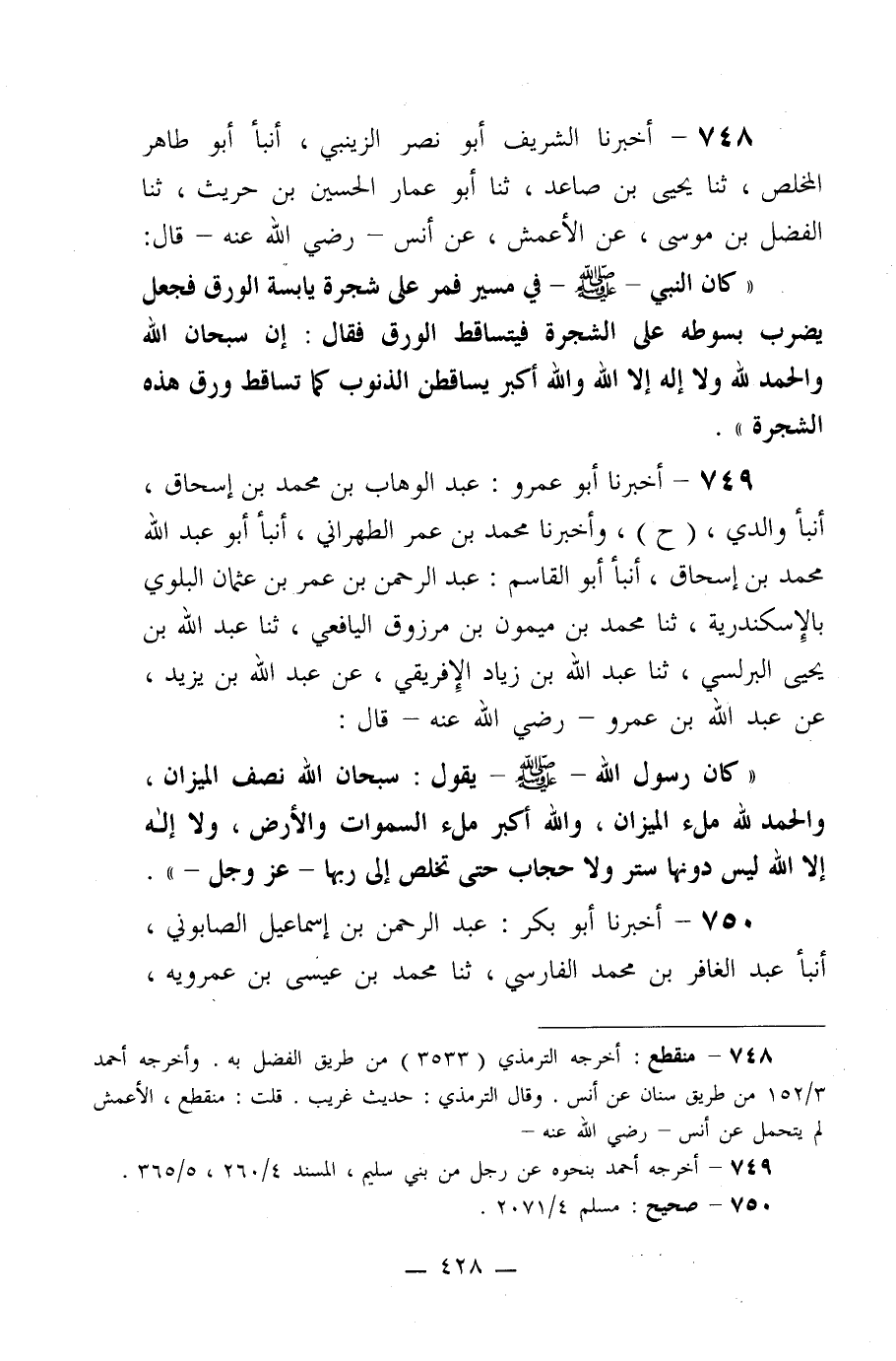 748- أخبرنا الشريف أبو نصر الزينبي، أنبأ أبو طاهر المخلص، ثنا يحيى بن صاعد، ثنا أبو عمار الحسين بن حريث، ثنا الفضل بن موسى، عن الأعمش، عن أنس –رضي الله عنه- قال:
