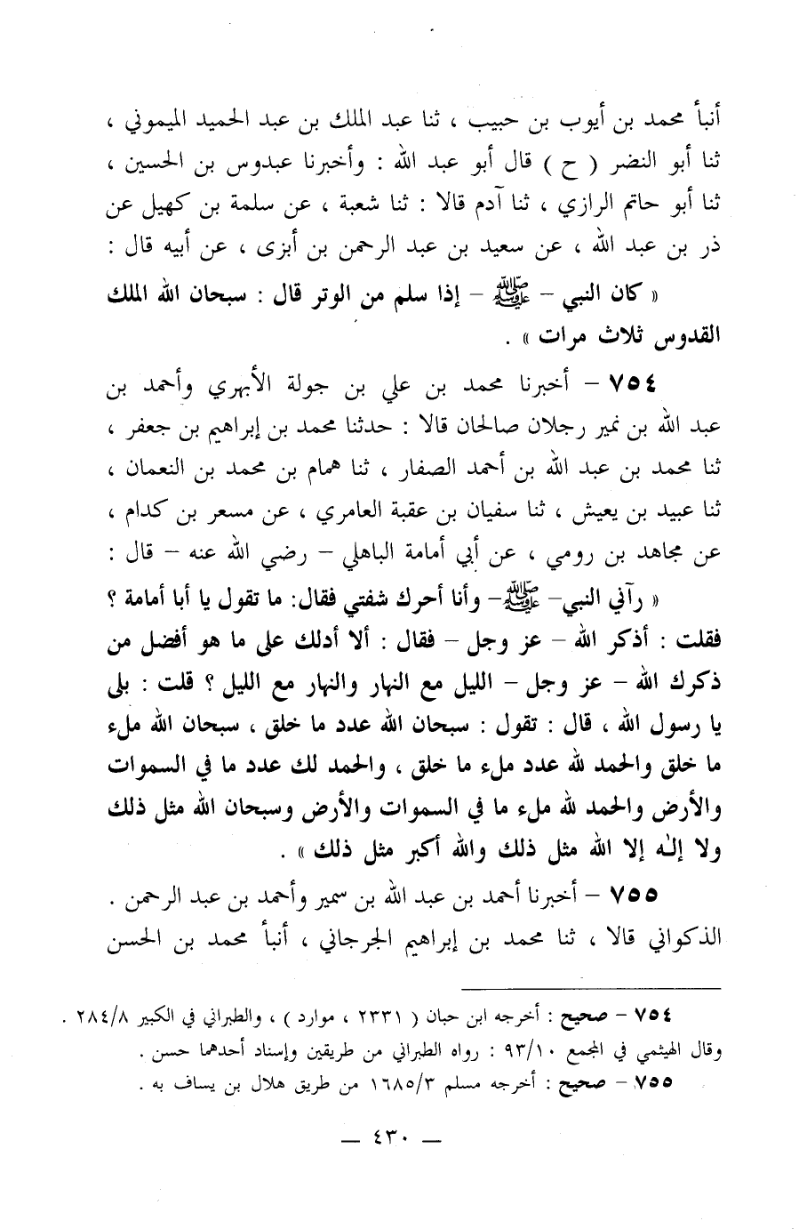 ((رآني النبي صلى الله عليه وسلم وأنا أحرك شفتي فقال: ما تقول يا أبا أمامة؟ فقلت: أذكر الله –عز وجل- فقال: ألا أدلك على ما هو أفضل من ذكرك الله –عز وجل- الليل مع النهار والنهار مع الليل؟ قلت: بلى يا رسول الله، قال: تقول: سبحان الله عدد ما خلق، سبحان الله ملء ما خلق والحمد لله عدد ملء ما خلق، والحمد لك عدد ما في السموات والأرض والحمد لله ملء ما في السموات والأرض وسبحان الله مثل ذلك ولا إله إلا الله مثل ذلك والله أكبر مثل ذلك)) .
