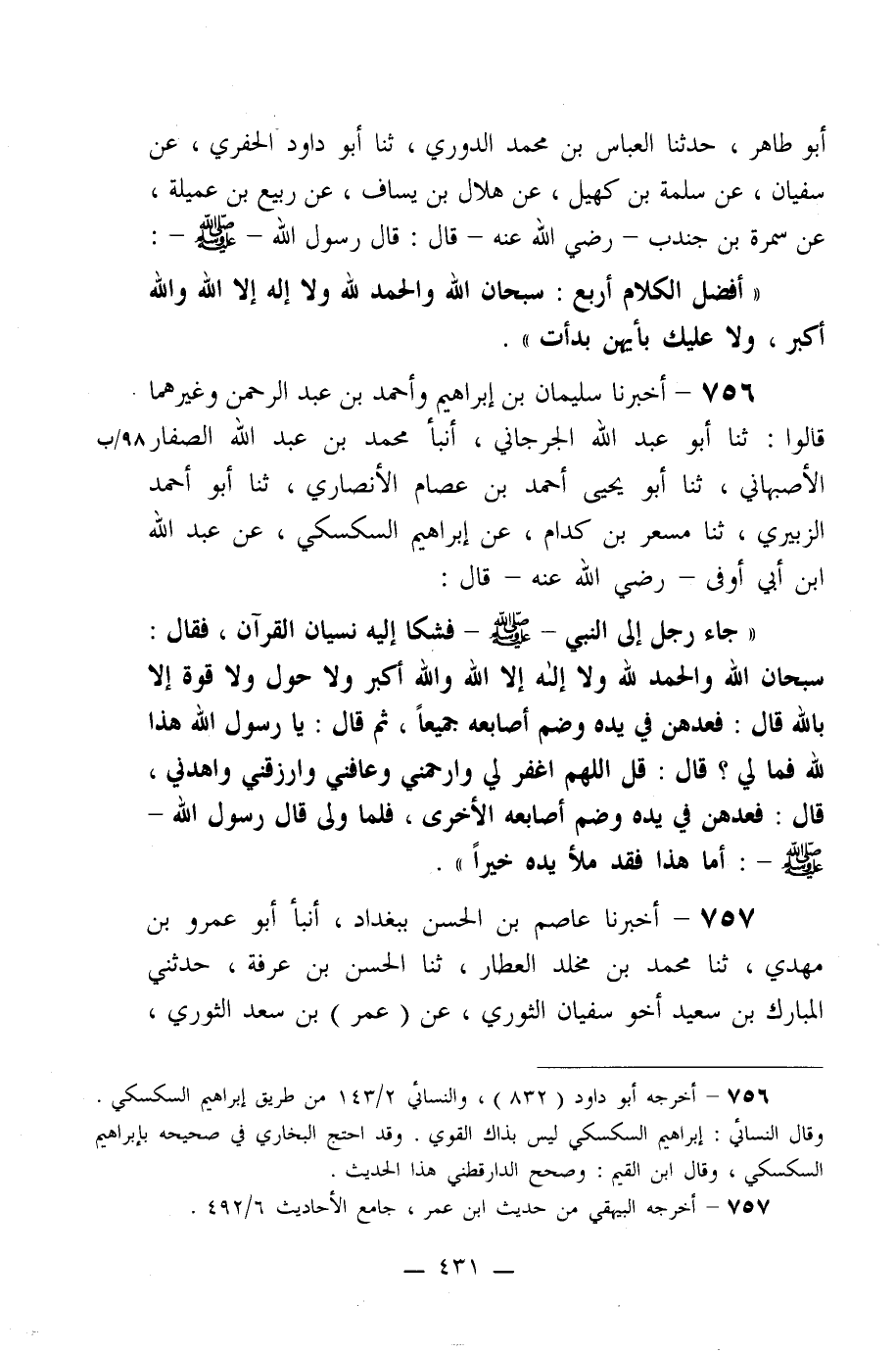756- أخبرنا سليمان بن إبراهيم وأحمد بن عبد الرحمن وغيرهما قالوا: ثنا أبو عبد الله الجرجاني، أنبأ محمد بن عبد الله الصفار الأصبهاني، ثنا أبو يحيى أحمد بن عصام الأنصاري، ثنا أبو أحمد الزبيري، ثنا مسعر بن كدام، عن إبراهيم السكسكي، عن عبد الله ابن أبي أوفى –رضي الله عنه- قال: