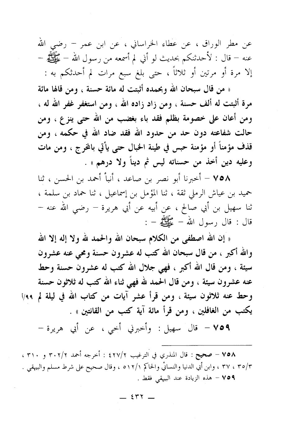 ((إن الله اصطفى من الكلام سبحان الله والحمد لله ولا إله إلا الله والله أكبر، من قال: سبحان الله كتب له عشرون حسنة ومحي عنه عشرون سيئة، ومن قال: الله أكبر، فهي جلال الله كتب له عشرون حسنة وحط عنه عشرون سيئة، ومن قال: الحمد لله فهي ثناء الله كتب له ثلاثون حسنة وحط عنه ثلاثون سيئة، ومن قرأ عشر آيات من كتاب الله في ليلة لم يكتب من الغافلين، ومن قرأ مائة آية كتب من القانتين)) .