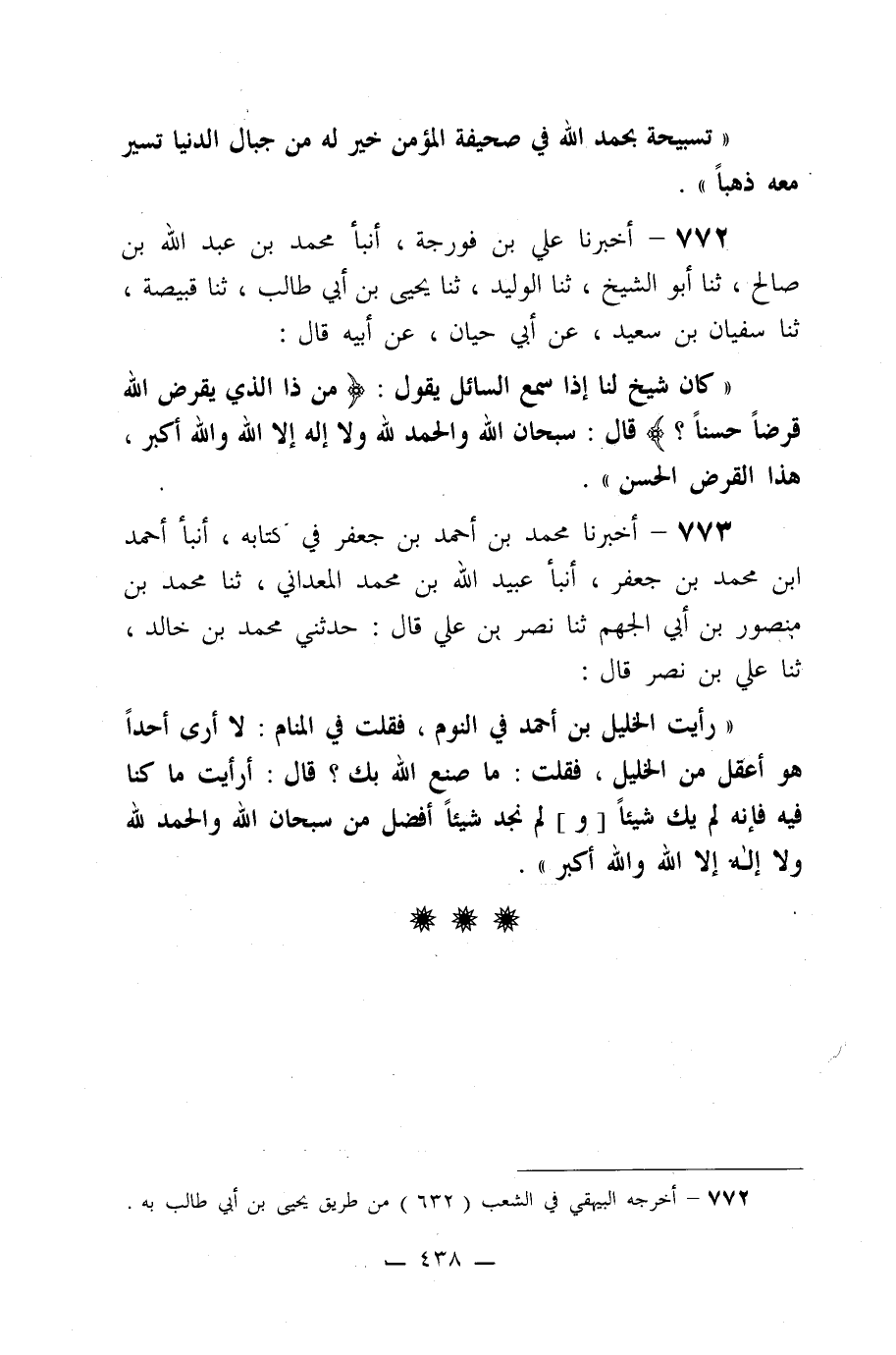 ((رأيت الخليل بن أحمد في النوم، فقلت في المنام: لا أرى أحداً هو أعقل من الخليل، فقلت: ما صنع الله بك؟ قال: أرأيت ما كنا فيه فإنه لم يكن شيئاً [و] لم نجد شيئاً أفضل من سبحان الله والحمد لله ولا إله إلا الله والله أكبر)) .