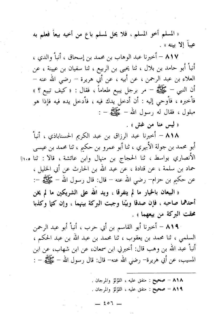 817- أخبرنا عبد الوهاب بن محمد بن إسحاق، أنبأ والدي، أنبأ أبو حامد بن بلال، ثنا يحيى بن الربيع، ثنا سفيان بن عيينة، عن العلاء بن عبد الرحمن، عن أبيه، عن أبي هريرة –رضي الله عنه- أن النبي صلى الله عليه وسلم مر برجل يبيع طعاماً، فقال: ((كيف تبيع؟)) فأخبره، فأوحي إليه: أن أدخل يدك فيه، فأدخل يده فيه فإذا هو مبلول، فقال له رسول الله صلى الله عليه وسلم: