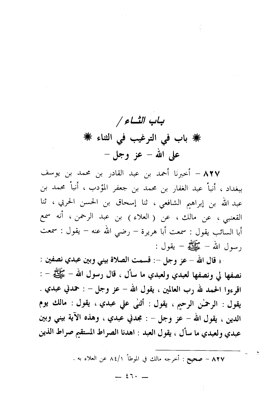 ((قال الله -عز وجل-: قسمت الصلاة بيني وبين عبدي نصفين: نصفها لي ونصفها لعبدي ولعبدي ما سأل، قال رسول الله صلى الله عليه وسلم: اقرءوا الحمد لله رب العالمين، يقول الله -عز وجل-: حمدني عبدي. يقول: الرحمن الرحيم، يقول: أثنى علي عبدي، يقول: مالك يوم الدين، يقول الله -عز وجل-: مجدني عبدي، وهذه الآية بيني وبين عبدي ولعبدي ما سأل، يقول العبد: اهدنا الصراط المستقيم صراط الذين -[461]- أنعمت عليهم غير المغضوب عليهم ولا الضالين، فهذه لعبدي ولعبدي ما سأل)) .