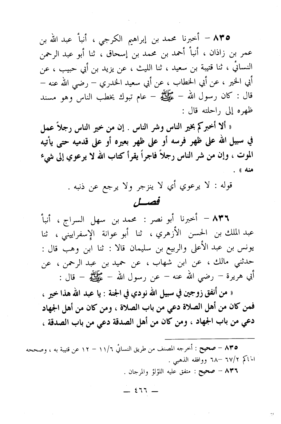 835- أخبرنا محمد بن إبراهيم الكرجي، أنبأ عبد الله بن عمر بن زاذان، أنبأ أحمد بن محمد بن إسحاق، ثنا أبو عبد الرحمن النسائي، ثنا قتيبة بن سعيد، ثنا الليث، عن يزيد بن أبي حبيب، عن أبي الخير، عن أبي الخطاب، عن أبي سعيد الخدري –رضي الله عنه- قال: كان رسول الله صلى الله عليه وسلم عام تبوك يخطب الناس وهو مسند ظهره إلى راحلته قال: