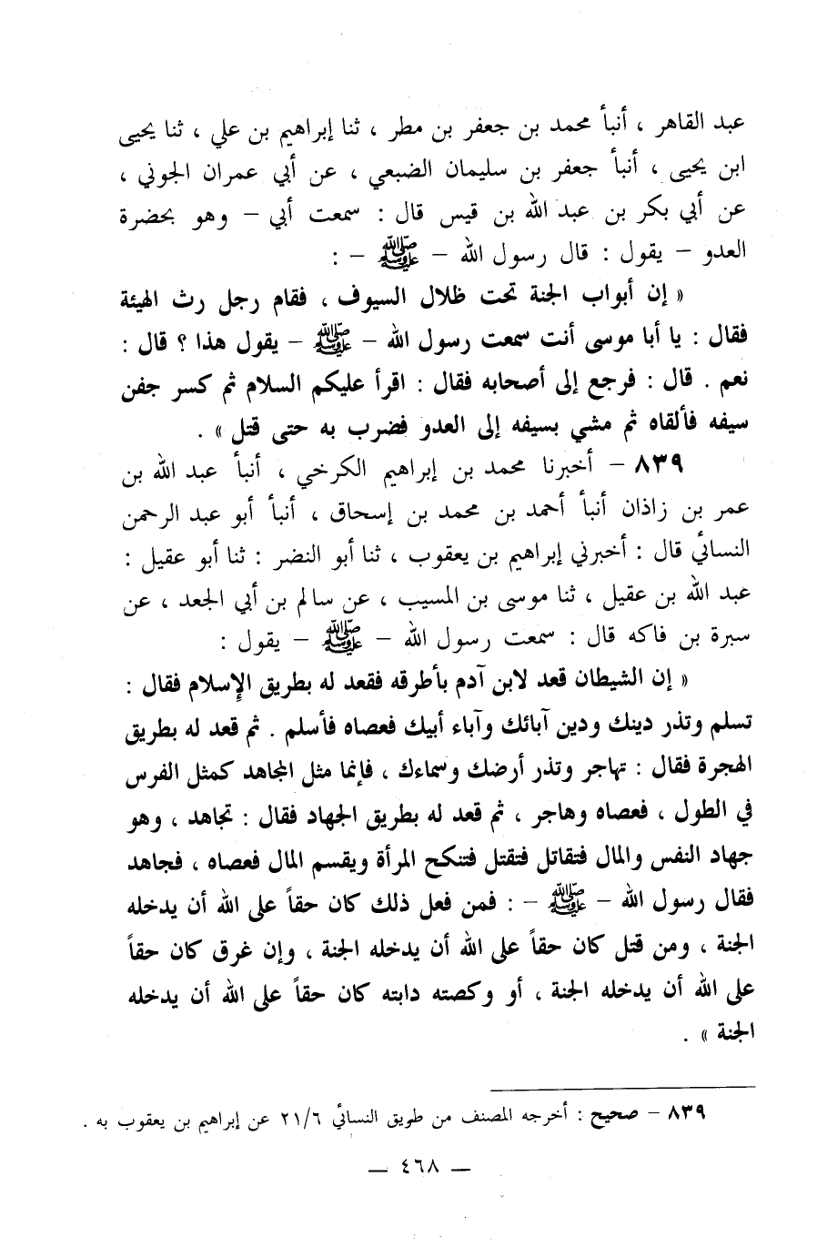 ((إن الشيطان قعد لابن آدم بأطرقه فقعد له بطريق الإسلام فقال: تسلم وتذر دينك ودين آبائك وآباء أبيك فعصاه فأسلم. ثم قعد له بطريق الهجرة فقال: تهاجر وتذر أرضك وسماءك، فإنما مثل المجاهد كمثل الفرس في الطول، فعصاه وهاجر، ثم قعد له بطريق الجهاد فقال: تجاهد، وهو جهاد النفس والمال فتقاتل فتقتل فتنكح المرأة ويقسم المال فعصاه، فجاهد فقال رسول الله صلى الله عليه وسلم: فمن فعل ذلك كان حقاً على الله أن يدخله الجنة، ومن قتل كان حقاً على الله أن يدخله الجنة، وإن غرق كان حقاً على الله أن يدخله الجنة، أو وكصته دابته كان حقاً على الله أن يدخله الجنة)) .