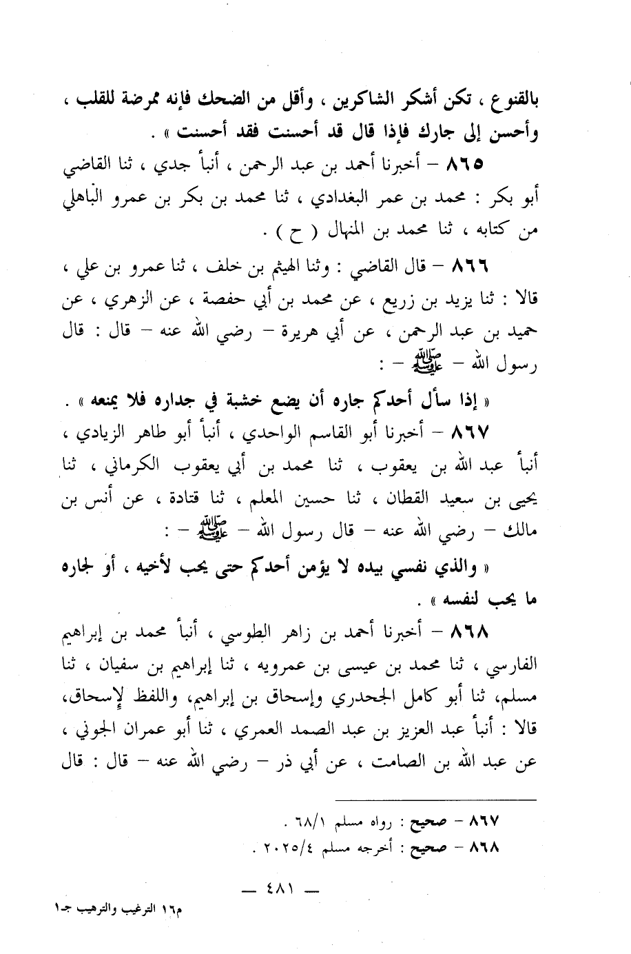 867- أخبرنا أبو القاسم الواحدي، أنبأ أبو طاهر الزيادي، أنبأ عبد الله بن يعقوب، ثنا محمد بن أبي يعقوب الكرماني، ثنا يحيى بن سعيد القطان، ثنا حسين المعلم، ثنا قتادة، عن أنس بن مالك –رضي الله عنه- قال رسول الله صلى الله عليه وسلم:
