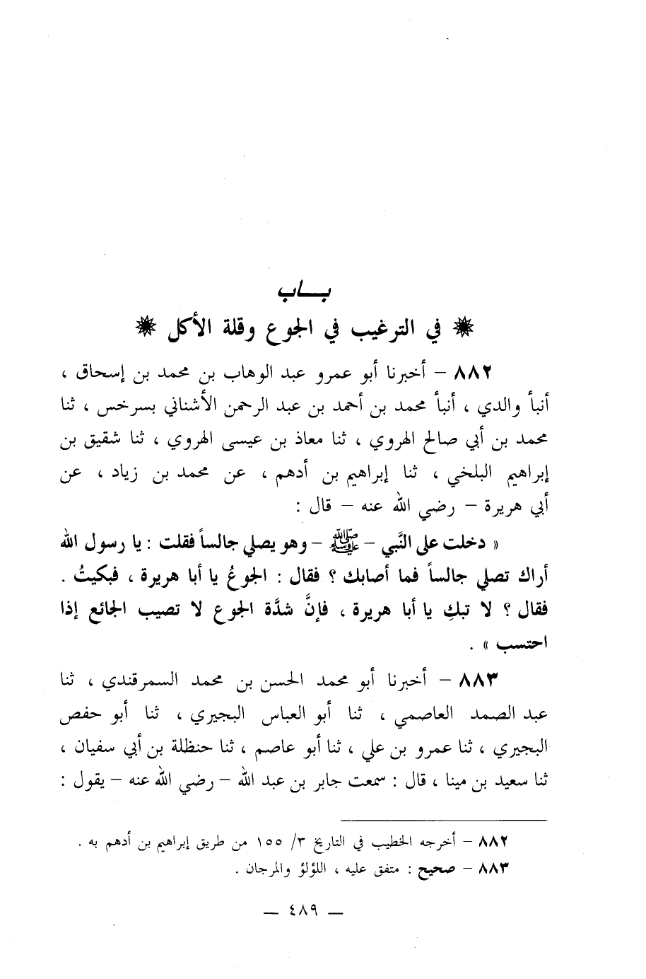 882- أخبرنا أبو عمرو عبد الوهاب بن محمد بن إسحاق، أنبأ والدي، أنبأ محمد بن أحمد بن عبد الرحمن الأشناني بسرخس، ثنا محمد بن أبي صالح الهروي، ثنا معاذ بن عيسى الهروي، ثنا شقيق بن إبراهيم البلخي، ثنا إبراهيم بن أدهم، عن محمد بن زياد، عن أبي هريرة –رضي الله عنه- قال: