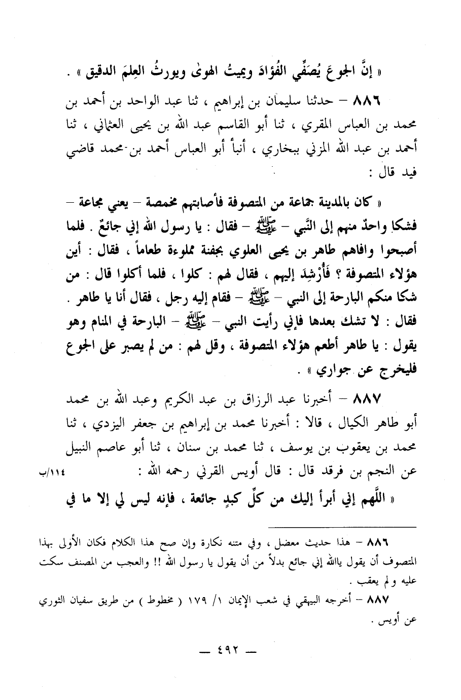 887- أخبرنا عبد الرزاق بن عبد الكريم وعبد الله بن محمد أبو طاهر الكيال، قالا: أخبرنا محمد بن إبراهيم بن جعفر اليزدي، ثنا محمد بن يعقوب بن يوسف، ثنا محمد بن سنان، ثنا أبو عاصم النبيل عن النجم بن فرقد قال: قال أويس القرني رحمه الله: