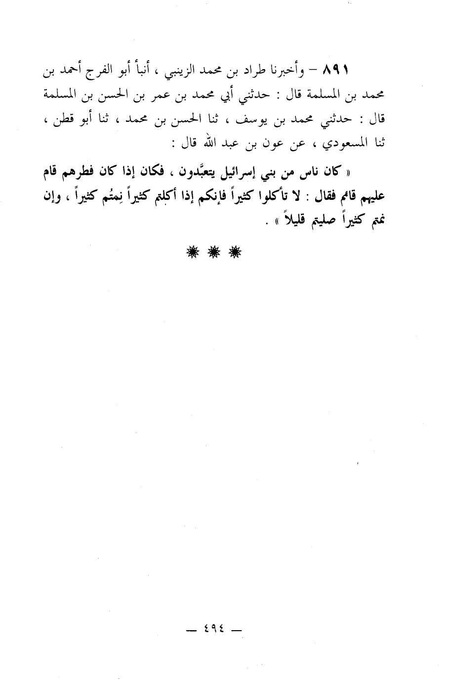 891- وأخبرنا طراد بن محمد الزينبي، أنبأ أبو الفرج أحمد بن محمد بن المسلمة قال: حدثني أبي محمد بن عمر بن الحسن بن المسلمة قال: حدثني محمد بن يوسف، ثنا الحسن بن محمد، ثنا أبو قطن، ثنا المسعودي، عن عون بن عبد الله قال: