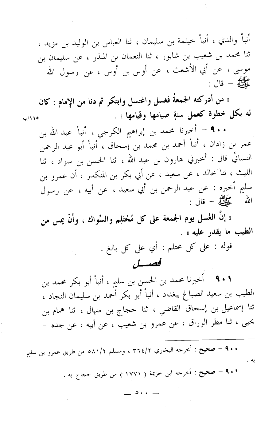 901- أخبرنا محمد بن الحسن بن سليم، أنبأ أبو بكر بن الطيب بن سعيد الصباغ ببغداد، أنبأ أبو بكر أحمد بن سليمان النجاد، ثنا إسماعيل بن إسحاق القاضي، ثنا حجاج بن منهال، ثنا همام بن يحيى، ثنا مطر الوراق، عن عمرو بن شعيب، عن أبيه، عن جده - -[501]- رضي الله عنه- أن النبي صلى الله عليه وسلم قال: