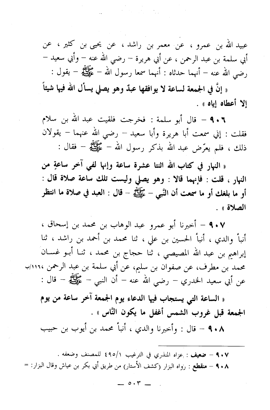 906- قال أبو سلمة: فخرجت فلقيت عبد الله بن سلام فقلت: إني سمعت أبا هريرة وأبا سعيد –رضي الله عنهما- يقولان ذلك، فلم يعرض عبد الله بذكر رسول الله صلى الله عليه وسلم فقال: