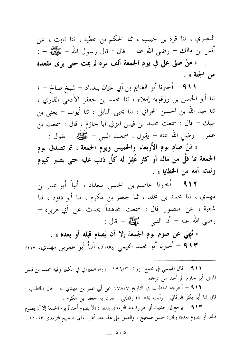 911- أخبرنا أبو الغنايم بن أبي عثمان ببغداد –شيخ صالح-؛ ثنا أبو الحسن بن رزقويه إملاء، ثنا محمد بن جعفر الآدمي القاري، ثنا عبد الله بن الحسن الحراني، ثنا يحيى البابلي، ثنا أيوب –يعني بن نهيك- قال: سمعت محمد بن قيس المزني أبا حازم، قال: سمعت بن عمر –رضي الله عنه- يقول: سمعت النبي صلى الله عليه وسلم يقول: