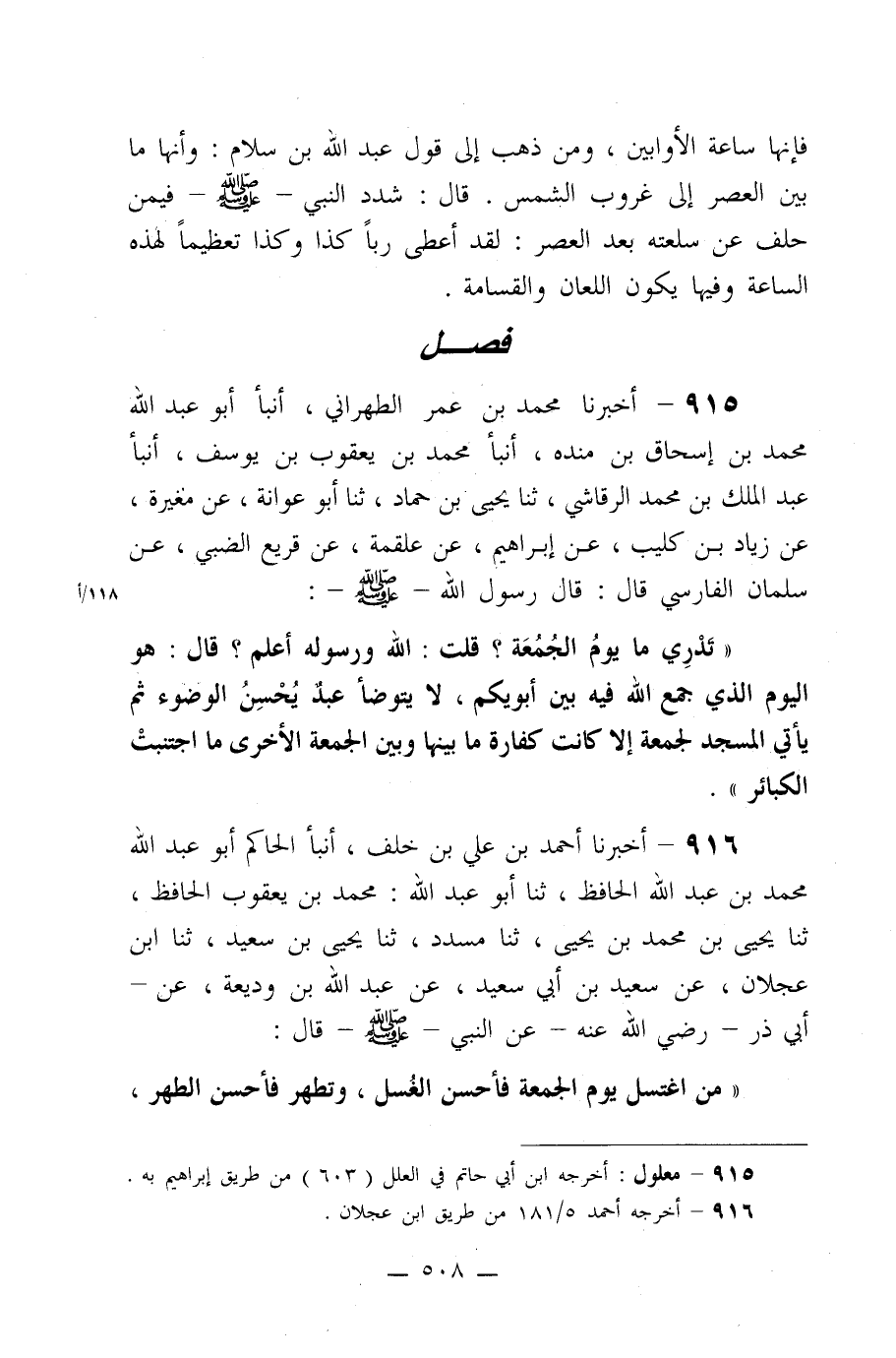 915- أخبرنا محمد بن عمر الطهراني، أنبأ أبو عبد الله محمد بن إسحاق بن منده، أنبأ محمد بن يعقوب بن يوسف، أنبأ عبد الملك بن محمد الرقاشي، ثنا يحيى بن حماد، ثنا أبو عوانة، عن مغيرة، عن زياد بن كليب، عن إبراهيم، عن علقمة، عن قريع الضبي، عن سلمان الفارسي قال: قال رسول الله صلى الله عليه وسلم: