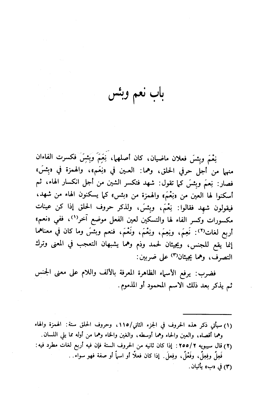 نِعْمَ وبِئسَ فعلان ماضيان, كان أصلهما, نِعَمَ وبِئسَ فكسرت الفاءان منهما من أجل حرفي الحلق, وهما: العين في "نِعَم", والهمزة في "بِئسَ" فصار: نِعمَ وبِئسَ كما تقول: شهد فتكسر الشين من أجل انكسار الهاء, ثم أسكنوا لها العين من "نِعْمَ"والهمزة من "بئس" كما يسكنون الهاء من شهد, فيقولون: شهِد فقالوا: نِعْمَ وبِئسَ, ولذكر حروف الحلق إذا كن عينات مكسورات وكسر الفاء لها والتسكين لعين الفعل موضع آخر1, ففي "نعم" أربع لغات2: نَعِمَ ونِعِمَ ونِعْمَ ونَعْمَ, فنعم وبئسَ وما كان في معناهما إنما يقع للجنس, ويجيئان لحمد وذم وهما يشبهان التعجب في المعنى وترك التصرف, وهما يجيئان3 على ضربين: