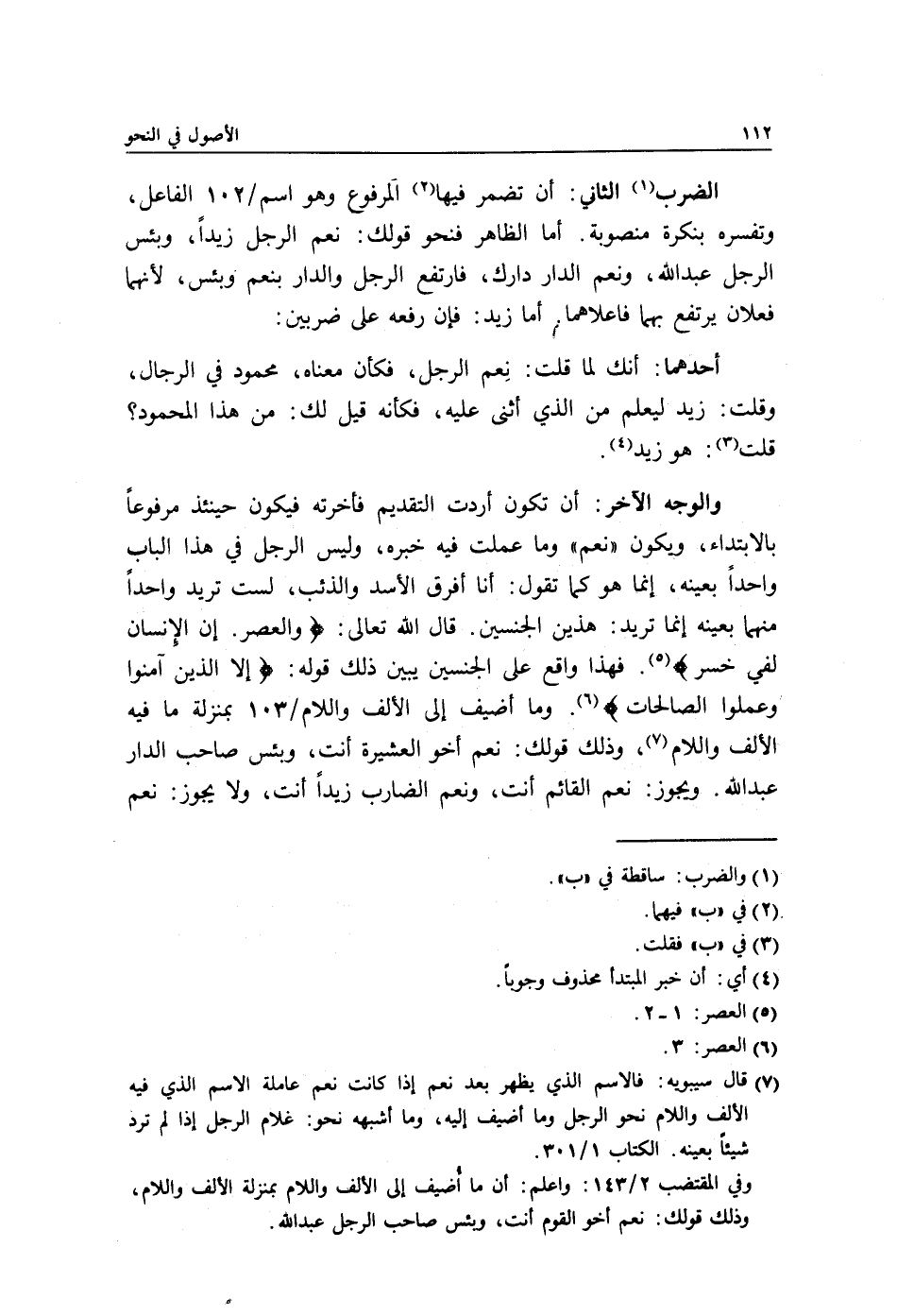 والوجه الآخر: أن تكون أردت التقديم فأخرته فيكون حينئذ مرفوعًا بالابتداء, ويكون "نعم" وما عملت فيه خبره, وليس الرجل في هذا الباب واحدًا بعينه, إنما هو كما تقول: أنا أفرق الأسد والذئب, لست تريد واحدًا منهما بعينه إنما تريد: هذين الجنسين. قال الله تعالى: {وَالْعَصْرِ، إِنَّ الْإِنْسَانَ لَفِي خُسْرٍ} 5. فهذا واقع على الجنسين يبين ذلك قوله: {إِلَّا الَّذِينَ آمَنُوا وَعَمِلُوا الصَّالِحَات} 6. وما أضيف إلى الألف واللام/ 103 بمنزلة ما فيه الألف واللام7, وذلك قولك: نعم أخو العشيرة أنت, وبئس صاحب الدار عبد الله. ويجوز: نعم القائم أنت, ونعم الضارب زيدًا أنت, ولا يجوز: نعم