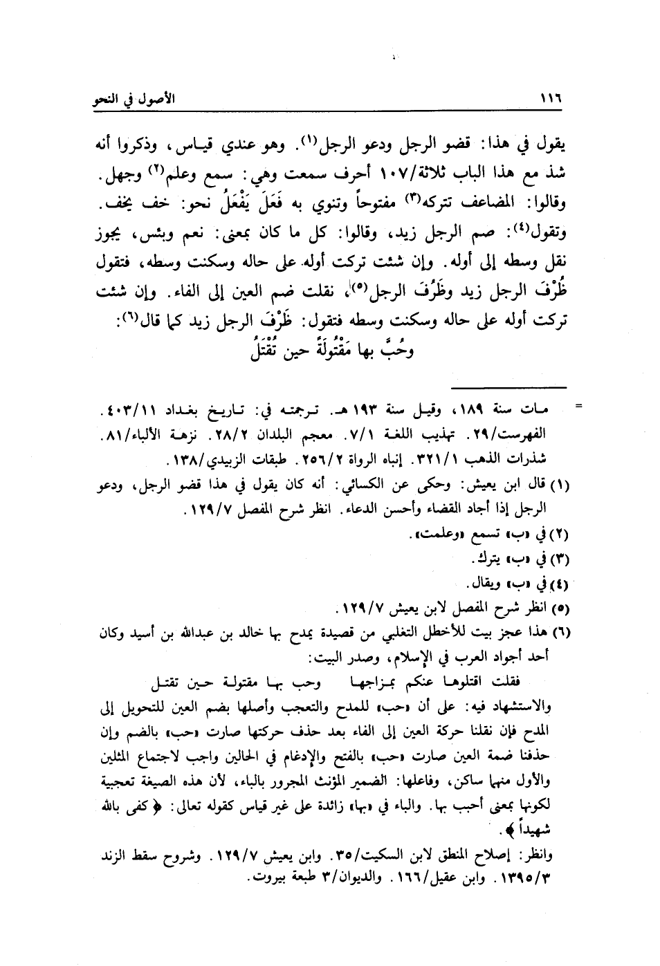 يقول في هذا: قضو الرجل ودعو الرجل1. وهو عندي قياس, وذكروا أنه شذ مع هذا الباب ثلاثة/ 107 أحرف سمعت وهي: سمع وعلم2 وجهل. وقالوا: المضاعف تتركه3 مفتوحًا وتنوي به فَعَلَ يَفْعَلُ نحو: خف يخف. وتقول4: صم الرجل زيد, وقالوا: كل ما كان بمعنى: نعم وبئس, يجوز نقل وسطه إلى أوله. وإن شئت تركت أوله على حاله وسكنت وسطه, فتقول: ظُرْفَ الرجل زيد وظَرُفَ الرجل5, نقلت ضم العين إلى الفاء. وإن شئت تركت أوله على حاله وسكنت وسطه فتقول: ظَرْفَ الرجل زيد كما قال6:
