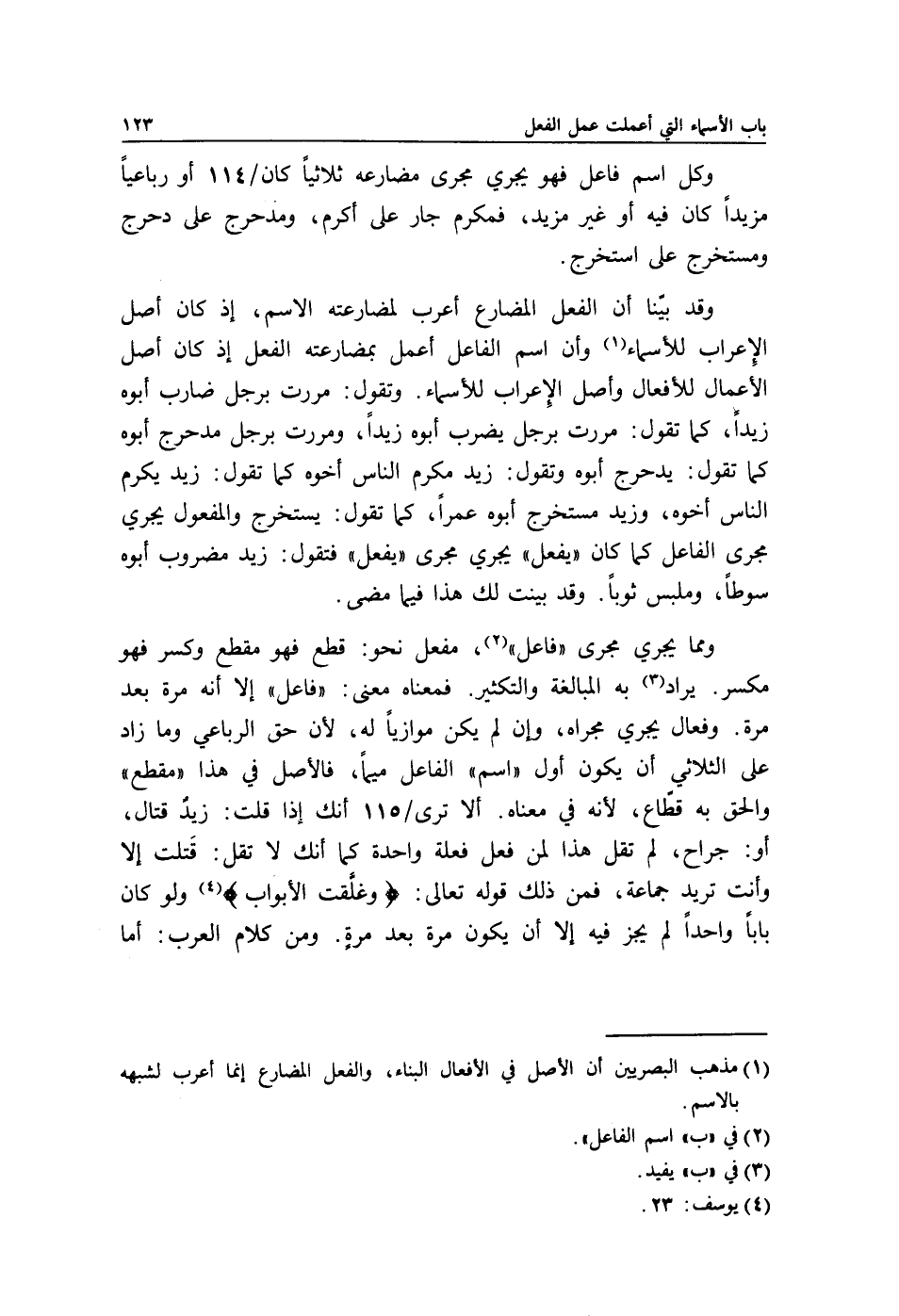 وكل اسم فاعل فهو يجري مجرى مضارعه ثلاثيا كان/ 114 أو رباعيا مزيدًا كان فيه أو غير مزيد, فمكرم جار على أكرم, ومدحرج على دحرج ومستخرج على استخرج.