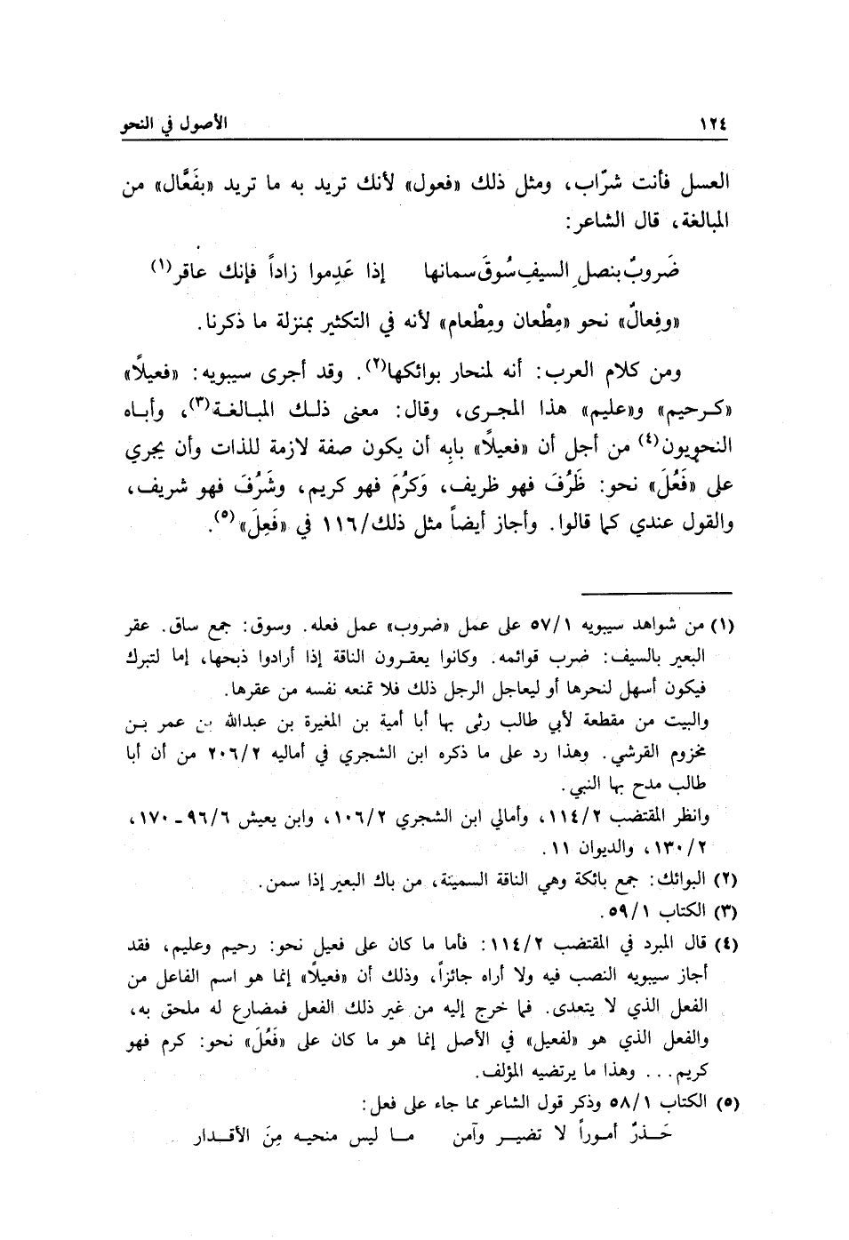 ومن كلام العرب: أنه لمنحار بوائكها2. وقد أجرى سيبويه: "فعيلًا" "كرحيم" و"عليم" هذا المجرى, وقال: معنى ذلك المبالغة3, وأباه النحويون4 من أجل أن "فعيلًا" بابِه أن يكون صفة لازمة للذات وأن يجري على "فَعُلَ" نحو: ظَرُفَ فهو ظريف, وَكرُمَ فهو كريم, وشَرُفَ فهو شريف, والقول عندي كما قالوا. وأجاز أيضًا مثل ذلك/ 116 في "فَعِلَ"5.