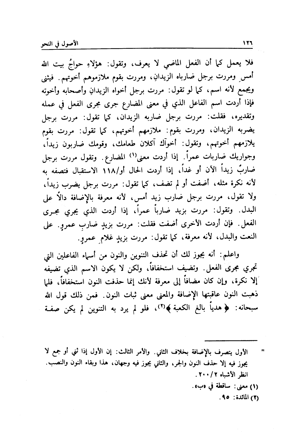 واعلم: أنه يجوز لك أن تحذف التنوين والنون من أسماء الفاعلين التي تجري مجرى الفعل. وتضيف استخفافًا, ولكن لا يكون الاسم الذي تضيفه إلا نكرة, وإن كان مضافًا إلى معرفة لأنك إنما حذفت النون استخفافًا, فلما ذهبت النون عاقبتها الإِضافة والمعنى معنى ثبات النون. فمن ذلك قول الله سبحانه: {هَدْيًا بَالِغَ الْكَعْبَةَ} 2, فلو لم يرد به التنوين لم يكن صفة