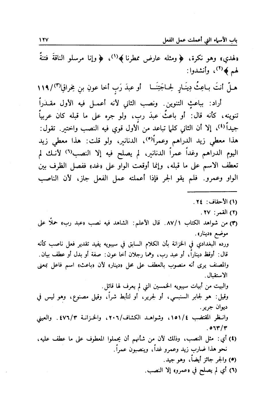 أراد: بباعثٍ التنوين. ونصب الثاني لأنه أعمل فيه الأول مقدرًا تنوينه, كأنه قال: أو باعثٌ عبدَ ربٍ, ولو جره على ما قبله كان عربيا جيدًا4, إلا أن الثاني كلما تباعد من الأول قوي فيه النصب واختير. تقول: هذا معطي زيد الدراهم وعمرًا5, الدنانير, ولو قلت: هذا معطي زيد اليوم الدراهم, وغدا عمرًا الدنانير, لم يصلح فيه إلا النصب6 لأنك لم تعطف الاسم على ما قبله, وإنما أوقعت الواو على "غد" ففصل الظرف بين الواو وعمرو. فلم يقو الجر فإذا أعملته عمل الفعل جاز, لأن الناصب