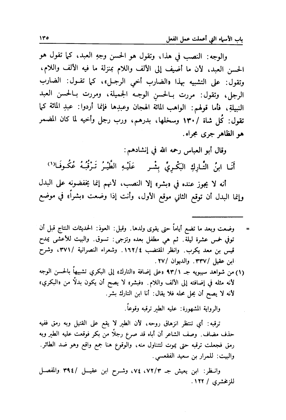1 من شواهد سيبويه جـ1/ 93 على إضافة "التارك" إلى البكري تشبيها بالحسن الوجه لأنه مثله في إضافته إلى الألف واللام. "فبشر" لا يصح أن يكون بدلا من "البكري" لأنه لا يصح أن يحل محله فلا يقال: أنا ابن التارك بشر.