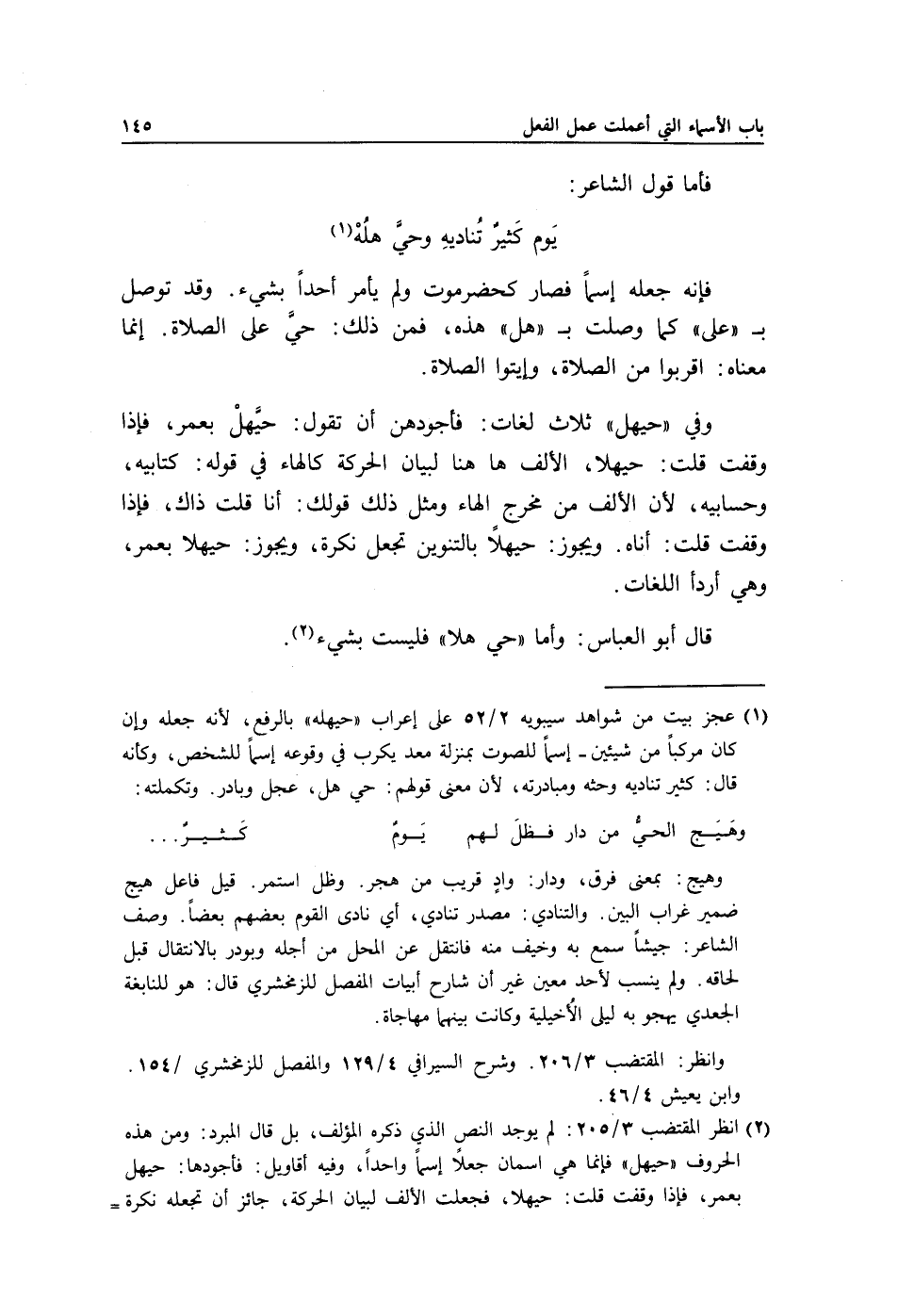 2 انظر المقتضب 3/ 205: لم يوجد النص الذي ذكره المؤلف، بل قال المبرد: ومن هذه الحروف "حيهل" فإنما هي اسمان جعلا اسما واحدا، وفيه أقاويل: فأجودها: حيهل بعمر، فإذا وقفت قلت: حيهلا، فجعلت الألف لبيان الحركة، جائز أن تجعله نكرة فتقول: حيهلا يا فتى، وجائز أن تثبت الألف وتجعله معرفة، فلا تنون، والألف زيادة ومعناه: قربه، وتقديره في العربية: بادر بذكره.