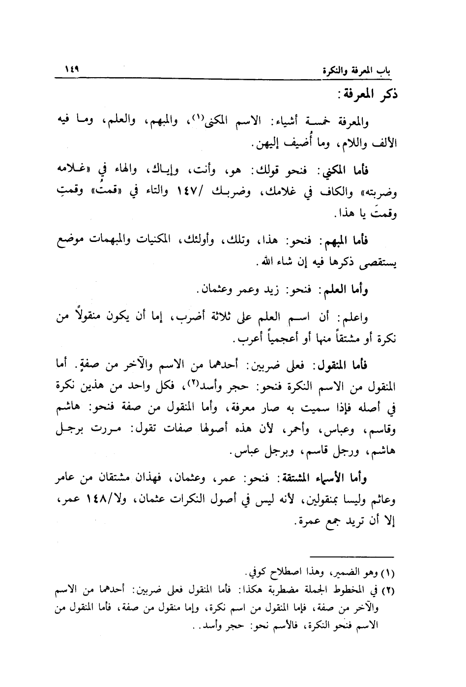 والمعرفة خمسة أشياء: الاسم المكني1, والمبهم, والعلم, وما فيه الألف واللام, وما أُضيف إليهن.