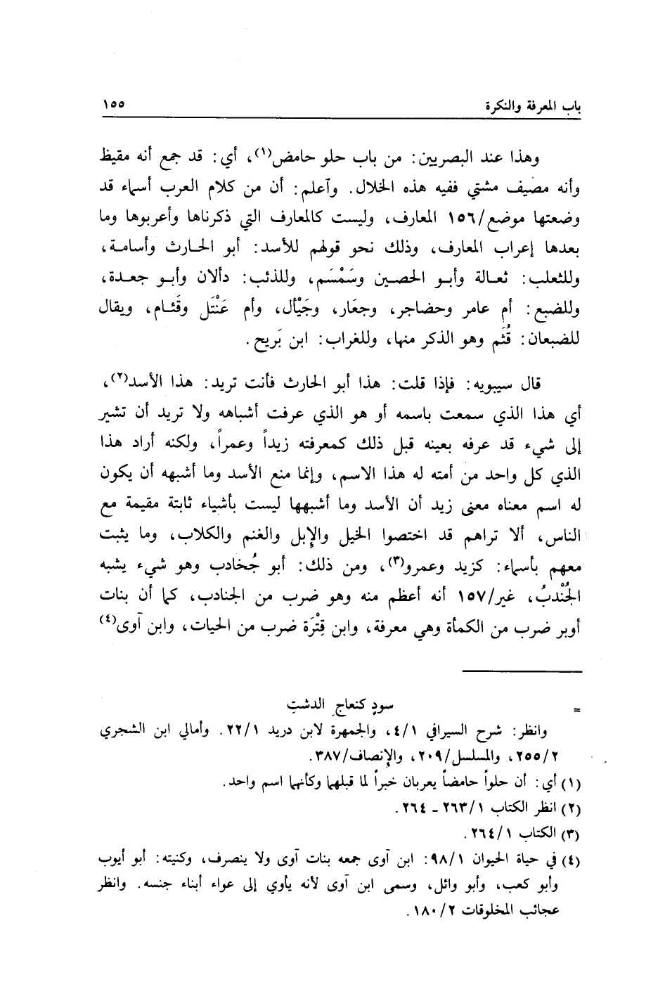 قال سيبويه: فإذا قلت: هذا أبو الحارث فأنت تريد: هذا الأسد2, أي: هذا الذي سمعت باسمه أو هو الذي عرفت أشباهه ولا تريد أن تشير إلى شيء قد عرفه بعينه قبل ذلك كمعرفته زيدًا وعمرًا, ولكنه أراد هذا الذي كل واحد من أمته له هذا الاسم وإنما منع الأسد وما أشبهه أن يكون له اسم معناه معنى زيد أن الأسد وما أشبهها ليست بأشياء ثابتة مقيمة مع الناس, ألا تراهم قد اختصوا الخيل والإِبل والغنم والكلاب, وما يثبت معهم بأسماء: كزيد وعمرو3, ومن ذلك: أبو جُخادب وهو شيء يشبه الجُنْدبُ, غير/ 157 أنه أعظم منه وهو ضرب من الجنادب, كما أن بنات أوبر ضرب من الكمأة وهي معرفة, وابن قِتْرَة ضرب من الحيات, وابن آوى4