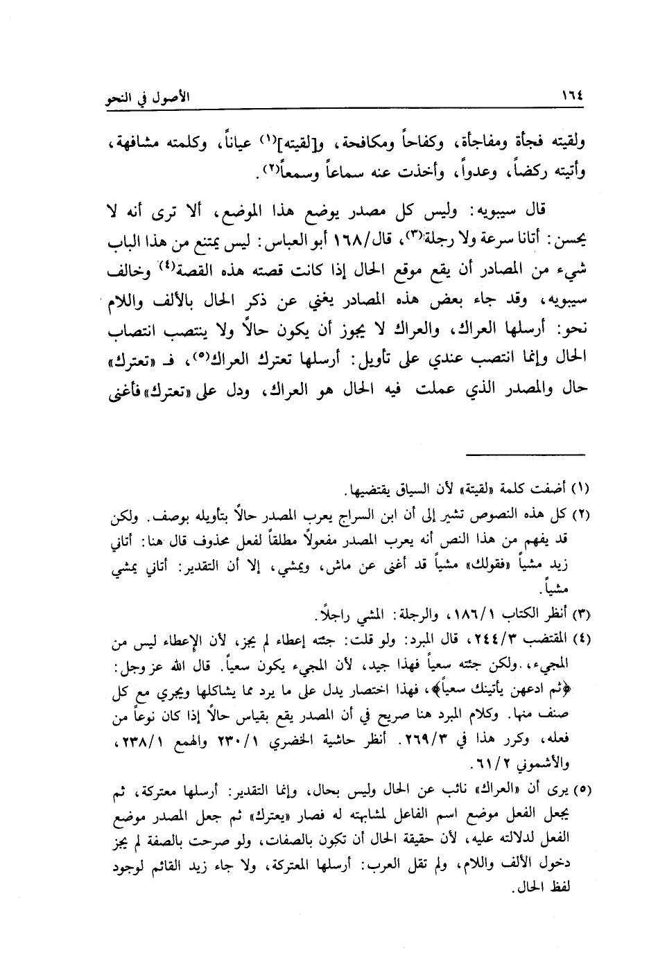 2 كل هذه النصوص تشير إلى أن ابن السراج يعرب المصدر حالا بتأويله بوصف. ولكن قد يفهم من هذا النص أنه يعرب المصدر مفعولا مطلقا لفعل محذوف قال هنا: أتاني زيد مشيا "فقولك" مشيا قد أغنى عن ماش، ويمشي، إلا أن التقدير: أتاني يمشي مشيا.