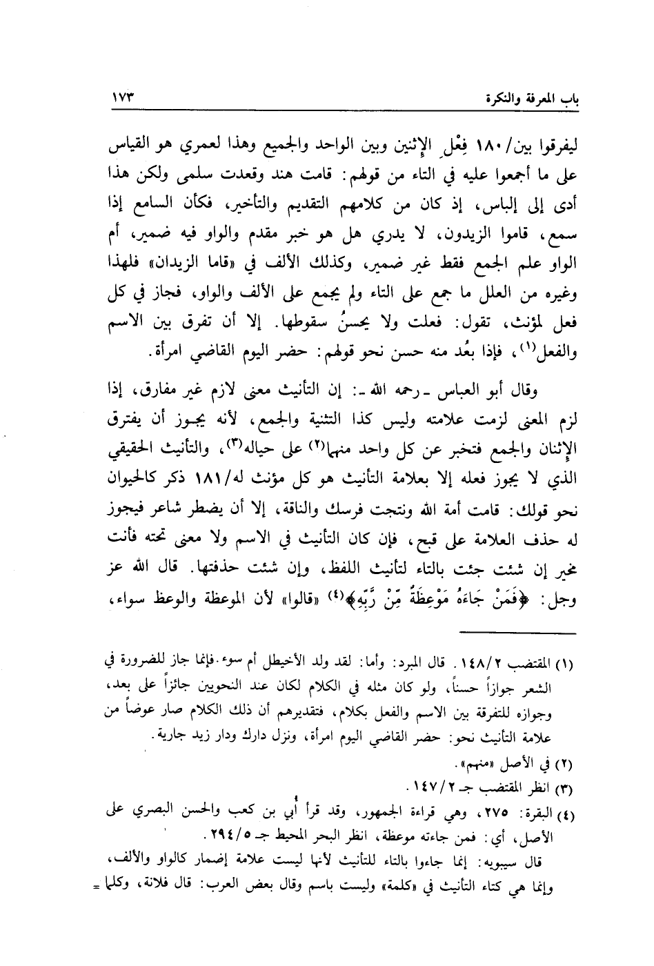وقال أبو العباس -رحمه الله: إن التأنيث معنى لازم غير مفارق, إذا لزم المعنى لزمت علامته وليس كذا التثنية والجمع لأنه يجوز أن يفترق الاثنان والجمع فتخبر عن كل واحد منهما2 على حياله3, والتأنيث الحقيقي الذي لا يجوز فعله إلا بعلامة التأنيث هو كل مؤنث له/ 181 ذكر كالحيوان نحو قولك: قامت أمة الله ونتجت فرسك والناقة, إلا أن يضطر شاعر فيجوز له حذف العلامة على قبح, فإن كان التأنيث في الاسم ولا معنى تحته فأنت مخير إن شئت جئت بالتاء لتأنيث اللفظ وإن شئت حذفتها. قال الله عز وجل: {فَمَنْ جَاءَهُ مَوْعِظَةٌ مِنْ رَبِّهِ} 4 "قالوا" لأن الموعظة والوعظ سواء،