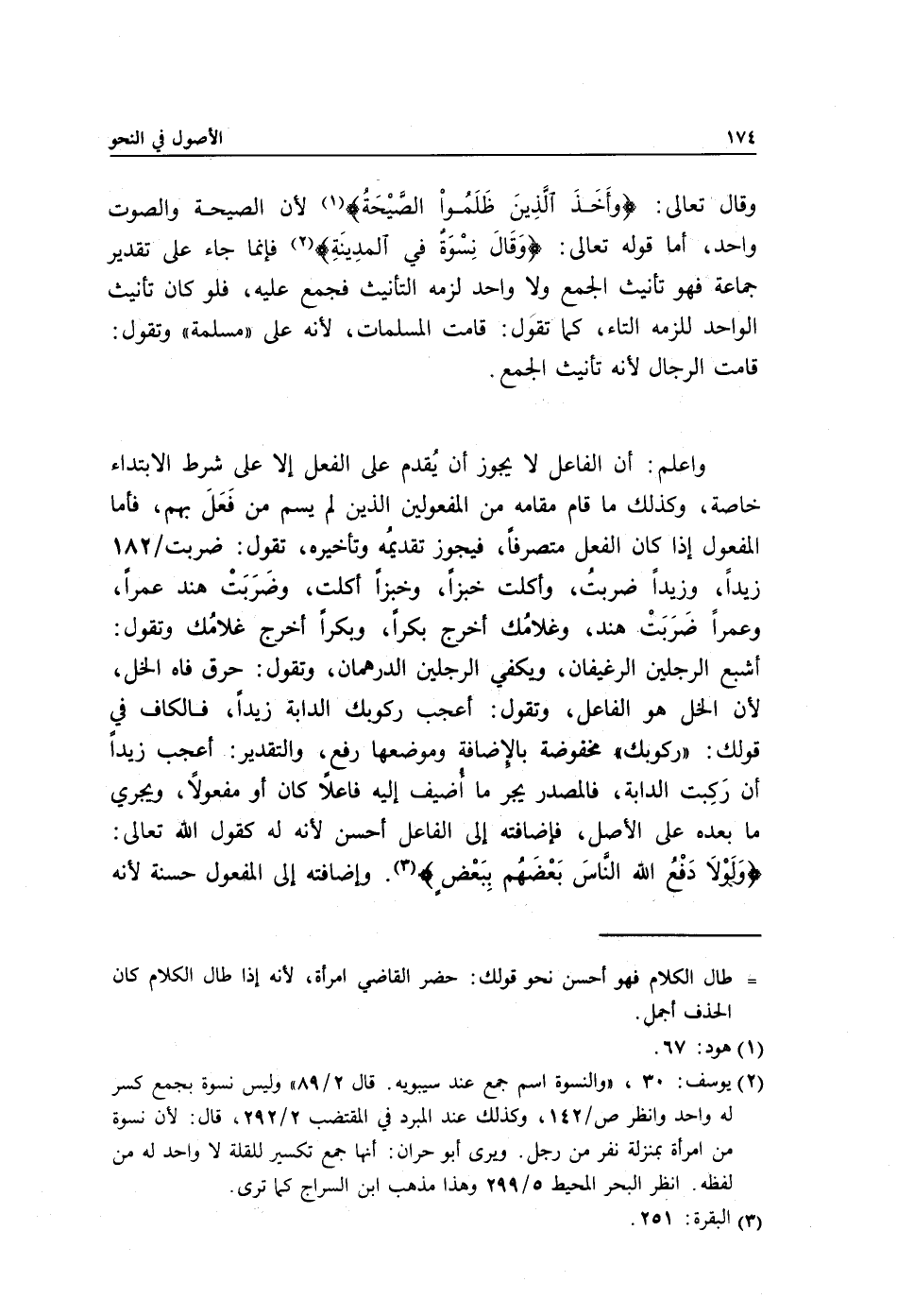 وقال تعالى: {وَأَخَذَ الَّذِينَ ظَلَمُوا الصَّيْحَةُ} 1, لأن الصيحة والصوت واحد أما قوله تعالى: {وَقَالَ نِسْوَةٌ فِي الْمَدِينَةِ} 2, فإنما جاء على تقدير جماعة فهو تأنيث الجمع ولا واحد لزمه التأنيث فجمع عليه, فلو كان تأنيث الواحد للزمه التاء كما تقول: قامت المسلمات, لأنه على "مسلمة" وتقول: قامت الرجال لأنه تأنيث الجمع.