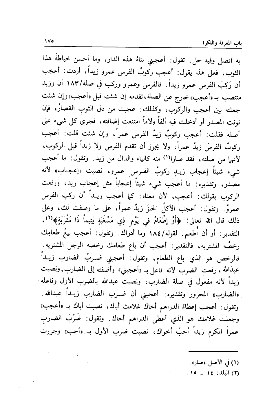 به اتصل وفيه حل. تقول: أعجبني بناءُ هذه الدار, وما أحسن خياطةَ هذا الثوب, فعلى هذا يقول: أعجب ركوبُ الفرس عمرو زيدًا أردت: أعجب أن رَكِبَ الفرس عمرو زيدًا. فالفرس وعمرو وركب في صلة/ 183 أن وزيد منتصب بـ"أعجب" خارج عن الصلة تقدمه إن شئت قبل "أعجب" وإن شئت جعلته بين أعجب والركوب وكذلك: عجبت من دق الثوبِ القصارُ, فإن نونت المصدر أو أدخلت فيه ألفًا ولامًا امتنعت إضافته فجرى كل شيء على أصله, فقلت: أعجب ركوبٌ زيدٌ الفرس عمرًا, وإن شئت قلت: أعجب ركوبٌ الفرسَ زيدٌ عمرًا, ولا يجوز أن تقدم الفرس ولا زيدًا قبل الركوب, لأنهما من صلته فقد صارا1 منه كالياء والدال من زيد. وتقول: ما أعجب شيء شيئًا إعجاب زيدٍ ركوبُ الفرسِ عمرو نصبت "إعجاب", لأنه مصدر وتقديره: ما أعجب شيء شيئًا إعجابا مثل إعجاب زيد ورفعت الركوب بقولك: أعجب لأن معناه: كما أعجب زيدًا أن ركب الفرس عمروٌ. وتقول: أعجب الأكلُ الخبزَ زيدٌ عمرًا على ما وصفت لك وعلى ذلك قال الله تعالى: {أَوْ إِطْعَامٌ فِي يَوْمٍ ذِي مَسْغَبَةٍ, يَتِيمًا ذَا مَقْرَبَة} 2, التقدير: أو أن أُطعم. لقوله/ 184 وما أدراك. وتقول: أعجب بيعُ طعامِك رخصُه المشتريه فالتقدير: أعجب أن باع طعامك رخصه الرجل المشتريه. فالرخص هو الذي باع الطعام وتقول: أعجبني ضربُ الضارب زيدًا عبدَ الله رفعت الضرب, لأنه فاعل بـ"أعجبني" وأضفته إلى الضارب, ونصبت زيدًا لأنه مفعول في صلة الضارب, ونصبت عبد الله بالضرب الأول وفاعله "الضارب" المجرور وتقديره: أعجبني أن ضرب الضارب زيدًا عبد الله. وتقول: أعجب إعطاءٌ الدراهم أخاك غلامك أباك نصبت أباك بـ"أعجب" وجعلت غلامك هو الذي أعطى الدراهم أخاك. وتقول: ضَرْبَ الضاربِ عمرًا المكرم زيدًا أحبَّ أخواك نصبت ضرب الأول بـ"أحب" وجررت