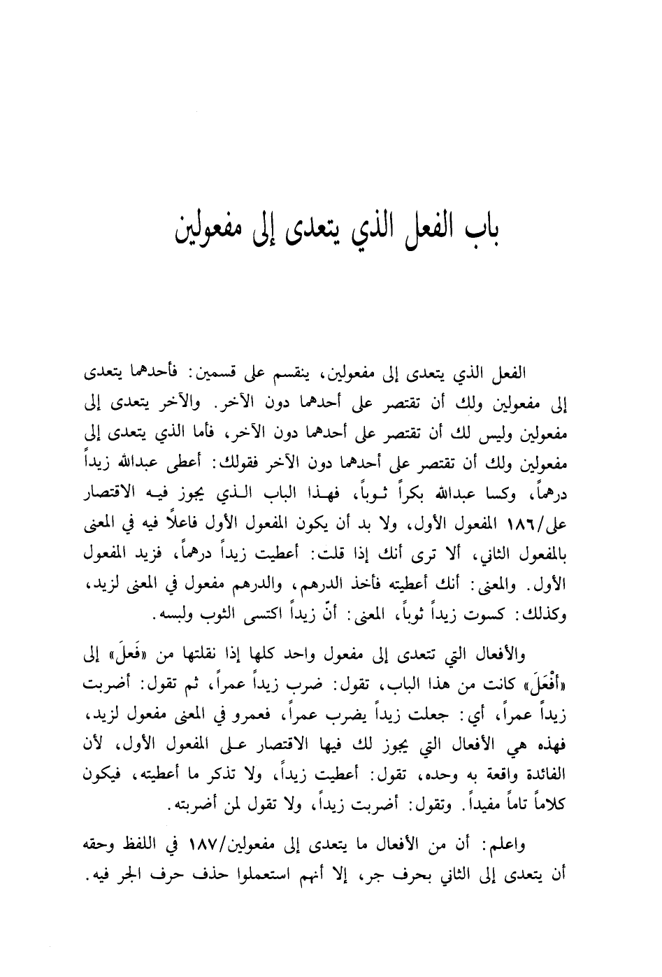 والأفعال التي تتعدى إلى مفعول واحد كلها إذا نقلتها من "فَعلَ" إلى "أفْعَلَ" كانت من هذا الباب تقول: ضرب زيدًا عمرًا ثم تقول: أضربت زيدًا عمرًا أي: جعلت زيدًا يضرب عمرًا, فعمرو في المعنى مفعول لزيد فهذه هي الأفعال التي يجوز لك فيها الاقتصار على المفعول الأول, لأن الفائدة واقعة به وحده تقول: أعطيت زيدًا ولا تذكر ما أعطيته فيكون كلامًا تاما مفيدًا. وتقول: أضربت زيدًا ولا تقول لمن أضربته.