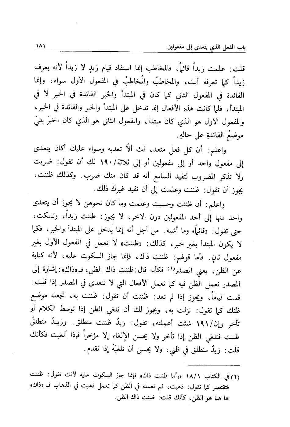 1 في الكتاب 1/ 18 "وأما ظننت ذاك" فإنما جاز السكوت عليه لأنك تقول: ظننت فتقتصر كما تقول: ذهبت، ثم تعمله في الظن كما تعمل ذهبت في الذهاب فـ"ذاك" ههنا هو الظن، كأنك قلت: ظننت ذاك الظن.