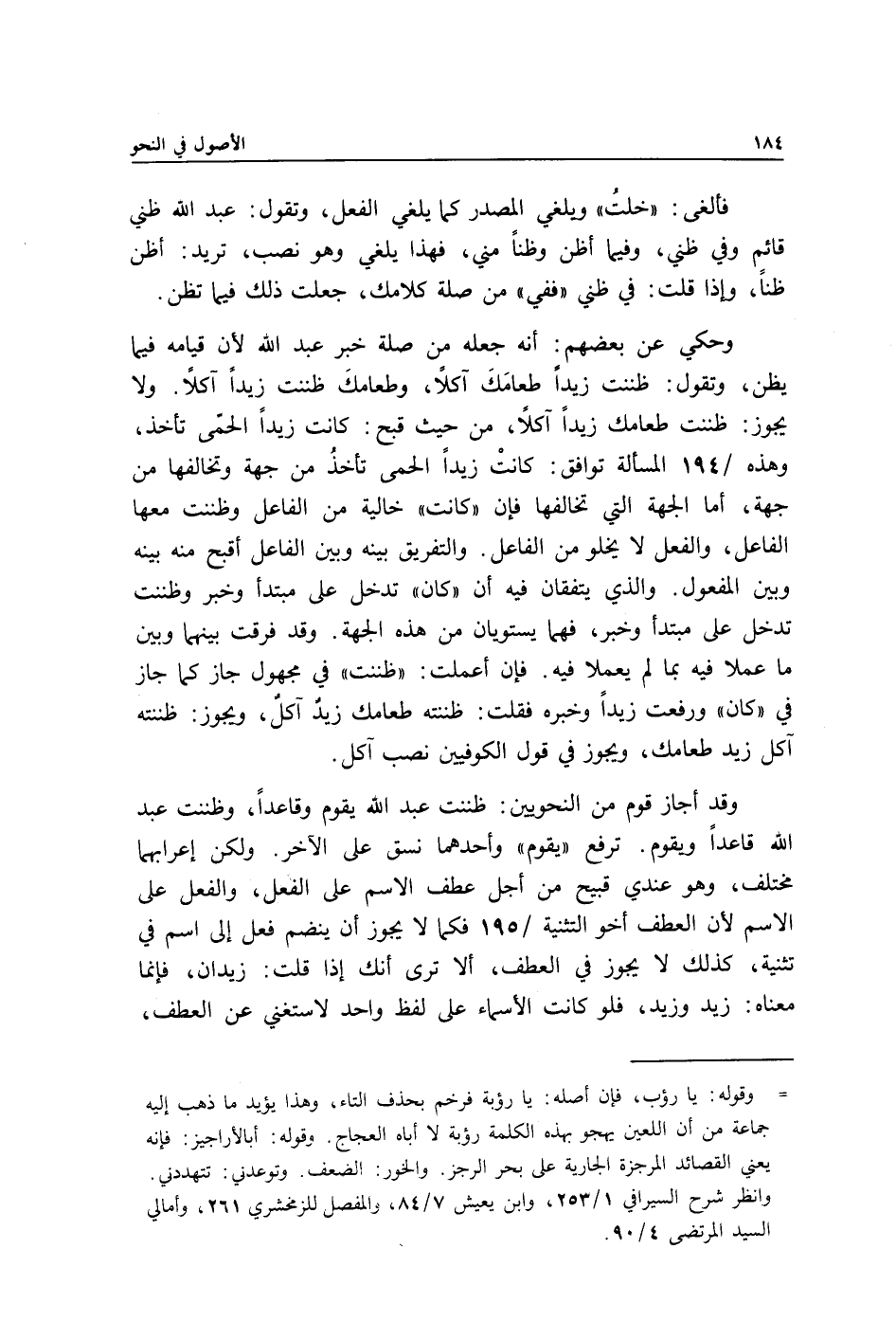 فألغى: "خلتُ" ويلغي المصدر كما يلغي الفعل, وتقول: عبد الله ظني قائم وفي ظني وفيما أظن وظنا مني, فهذا يلغي وهو نصب تريد: أظن ظنا وإذا قلت: في ظني "ففي" من صلة كلامك جعلت ذلك فيما تظن.