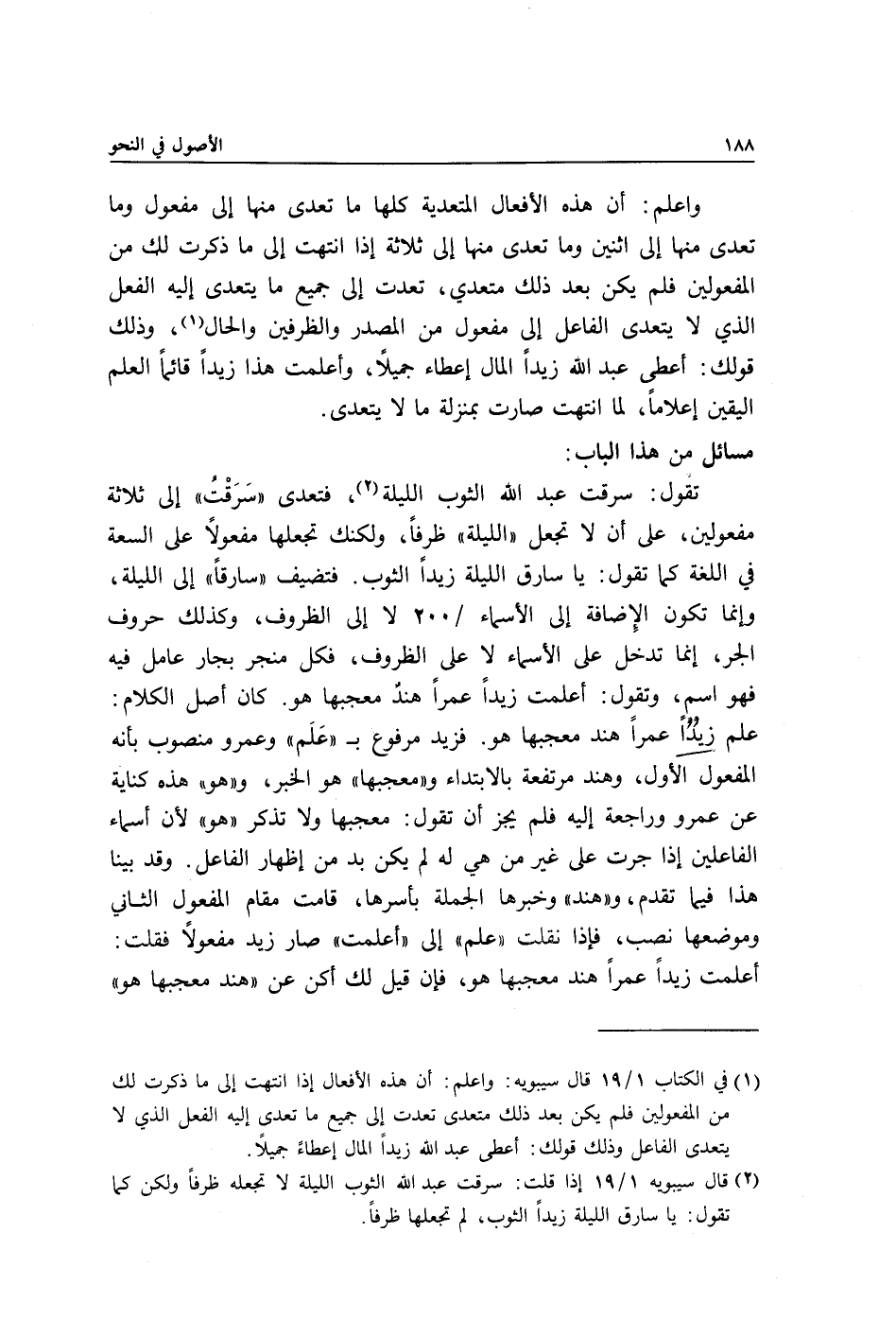1 في الكتاب 1/ 19 قال سيبويه: واعلم: أن هذه الأفعال إذا انتهت إلى ما ذكرت لك من المفعولين فلم يكن بعد ذلك متعدي تعدت إلى جميع ما تعدى إليه الفعل الذي لا يتعدى الفاعل وذلك قولك: أعطى عبد الله زيدا المال إعطاء جميلا.
