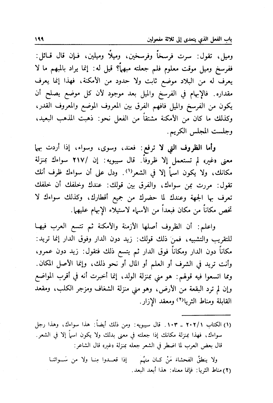 وميل. تقول: سرت فرسخًا وفرسخين وميلًا وميلين, فإن قال قائل: ففرسخ وميل موقت معلوم فلم جعلته مبهمًا؟ قيل له: إنما يراد بالمبهم ما لا يعرف له من البلاد موضع ثابت ولا حدود من الأمكنة, فهذا إنما يعرف مقداره. فالإِبهام في الفرسخ والميل بعد موجود, لأن كل موضع يصلح أن يكون من الفرسخ والميل فافهم الفرق بين المعروف الموضع والمعروف القدر, وكذلك ما كان من الأمكنة مشتقا من الفعل نحو: ذهبت المذهب البعيد, وجلست المجلس الكريم.