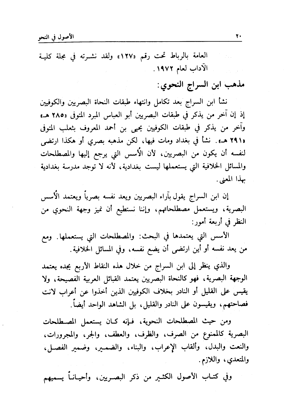 إن ابن السراج يقول بآراء البصريين ويعد نفسه بصريا ويعتمد الأسس البصرية، ويستعمل مصطلحاتهم، وإننا نستطيع أن نميز وجهة النحوي من النظر في أربعة أمور: