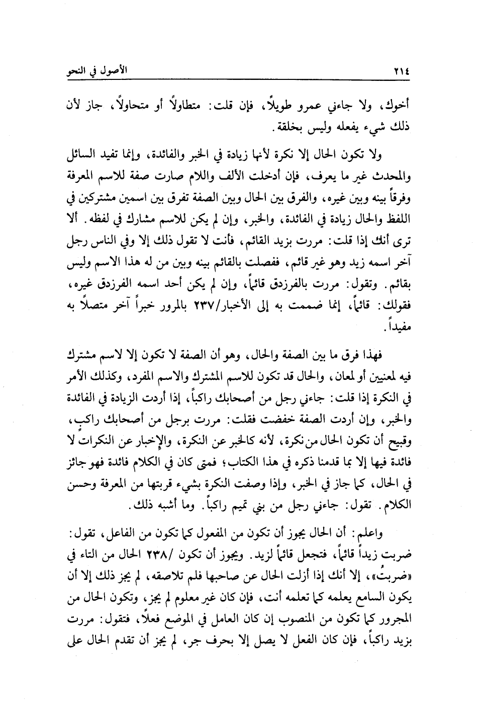 ولا تكون الحال إلا نكرة لأنها زيادة في الخبر والفائدة, وإنما تفيد السائل والمحدث غير ما يعرف, فإن أدخلت الألف واللام صارت صفة للاسم المعرفة وفرقًا بينه وبين غيره, والفرق بين الحال وبين الصفة تفرق بين اسمين مشتركين في اللفظ والحال زيادة في الفائدة والخبر, وإن لم يكن للاسم مشارك في لفظه. ألا ترى أنك إذا قلت: مررت بزيد القائم فأنت لا تقول ذلك إلا وفي الناس رجل آخر اسمه زيد وهو غير قائم ففصلت بالقائم بينه وبين من له هذا الاسم وليس بقائم. وتقول: مررت بالفرزدق قائمًا وإن لم يكن أحد اسمه الفرزدق غيره فقولك: قائمًا إنما ضممت به إلى الأخبار/ 237 بالمرور خبرًا آخر متصلًا به مفيدًا.