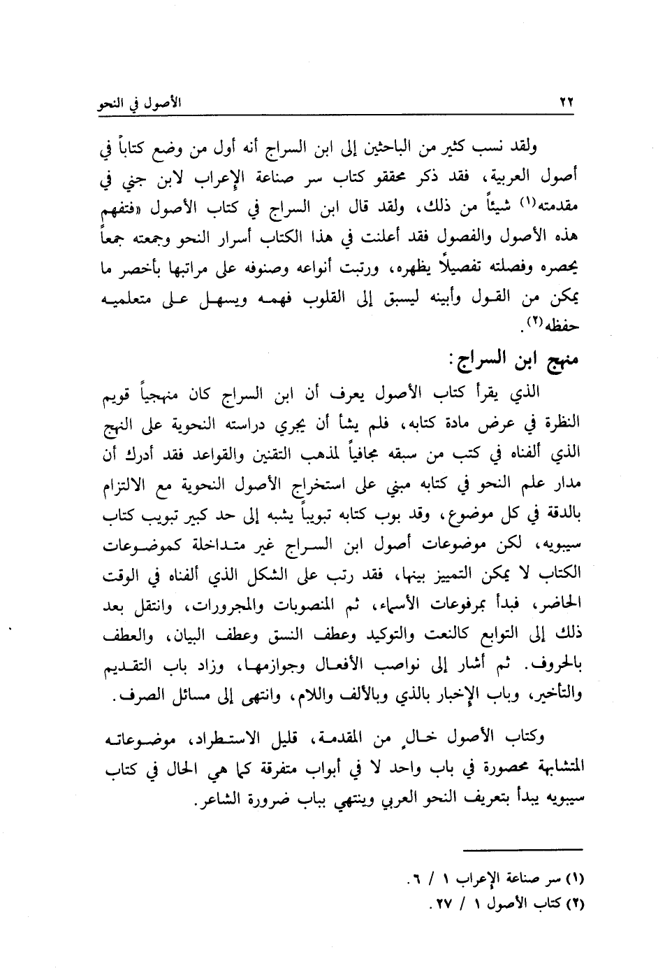ولقد نسب كثير من الباحثين إلى ابن السراج أنه أول من وضع كتابا في أصول العربية، فقد ذكر محققو سر صناعة الإعراب لابن جني في مقدمته1 شيئا من ذلك، ولقد قال ابن السراج في كتاب الأصول "فتفهم هذه الأصول والفصول فقد أعلنت في هذا الكتاب أسرار النحو وجمعته جمعا يحصره وفصلته تفصيلا يظهره، ورتبت أنواعه وصنوفه على مراتبها بأخصر ما يمكن من القول وأبينه ليسبق إلى القلوب فهمه ويسهل على متعلميه حفظه2.