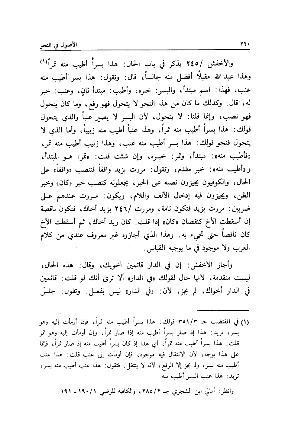 والأخفش/ 245 يذكر في باب الحال: هذا بسرًا أطيب منه تمرًا1 وهذا عبد الله مقبلًا أفضل منه جالسًا, قال: وتقول: هذا بسر أطيب منه عنب, فهذا: اسم مبتدأ, والبسر: خبره, وأطيب: مبتدأ ثانٍ, وعنب: خبر له, قال: وكذلك ما كان من هذا النحو لا يتحول فهو رفع, وما كان يتحول فهو نصب وإنما قلنا: لا يتحول, لأن البسر لا يصير عنبًا, والذي يتحول قولك: هذا بسرًا أطيب منه تمرًا, وهذا عنبًا أطيب منه زبيبًا, وأما الذي لا يتحول فنحو قولك: هذا بسر أطيب منه عنب, وهذا زبيب أطيب منه تمر "فأطيب منه": مبتدأ وتمر: خبره وإن شئت قلت: "تمر" هو المبتدأ و"أطيب منه": خبر مقدم وتقول: مررت بزيد واقفًا فتنصب "واقفًا" على الحال, والكوفيون يجيزون نصبه على الخبر يجعلونه كنصب خبر "كان" وخبر الظن ويجيزون فيه إدخال الألف واللام, ويكون: مررت عندهم على ضربين: مررت بزيد فتكون تامة, ومررت/ 246 بزيد أخاك فتكون ناقصة إن أسقطت الأخ كنقصان "كان" إذا قلت: كان زيد أخاك ثم أسقطت الأخ كان ناقصًا حتى تجيء به. وهذا الذي أجازوه غير معروف عندي من كلام العرب ولا موجود في ما يوجبه القياس.