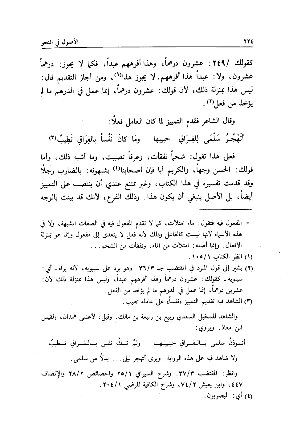 2 يشير إلى قول المبرد في المقتضب جـ3/ 36. وهو يرد على سيبويه، لأنه يراده -أي: سيبويه- كقولك: عشرون درهما وهذا أفرههم عبدا، وليس هذا بمنزلة ذلك لأن: عشرين درهما، إنما عمل في الدرهم ما لم يؤخذ من الفعل.