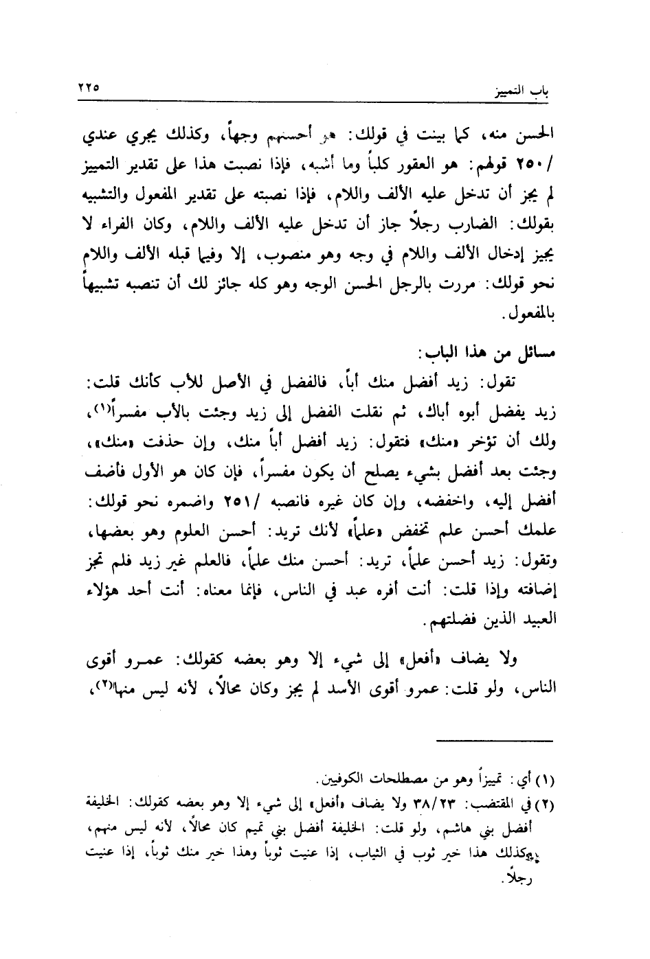 2 في المقتضب: 23/ 38 ولا يضاف "أفعل" إلى شيء إلا وهو بعضه كقولك: الخليفة أفضل بني هاشم، ولو قلت: الخليفة أفضل بني تميم كان محالا، لأنه ليس منهم، وكذلك هذا خير ثوب في الثياب، إذا عنيت ثوبا وهذا خير منك ثوبا، إذا عنيت رجلا.