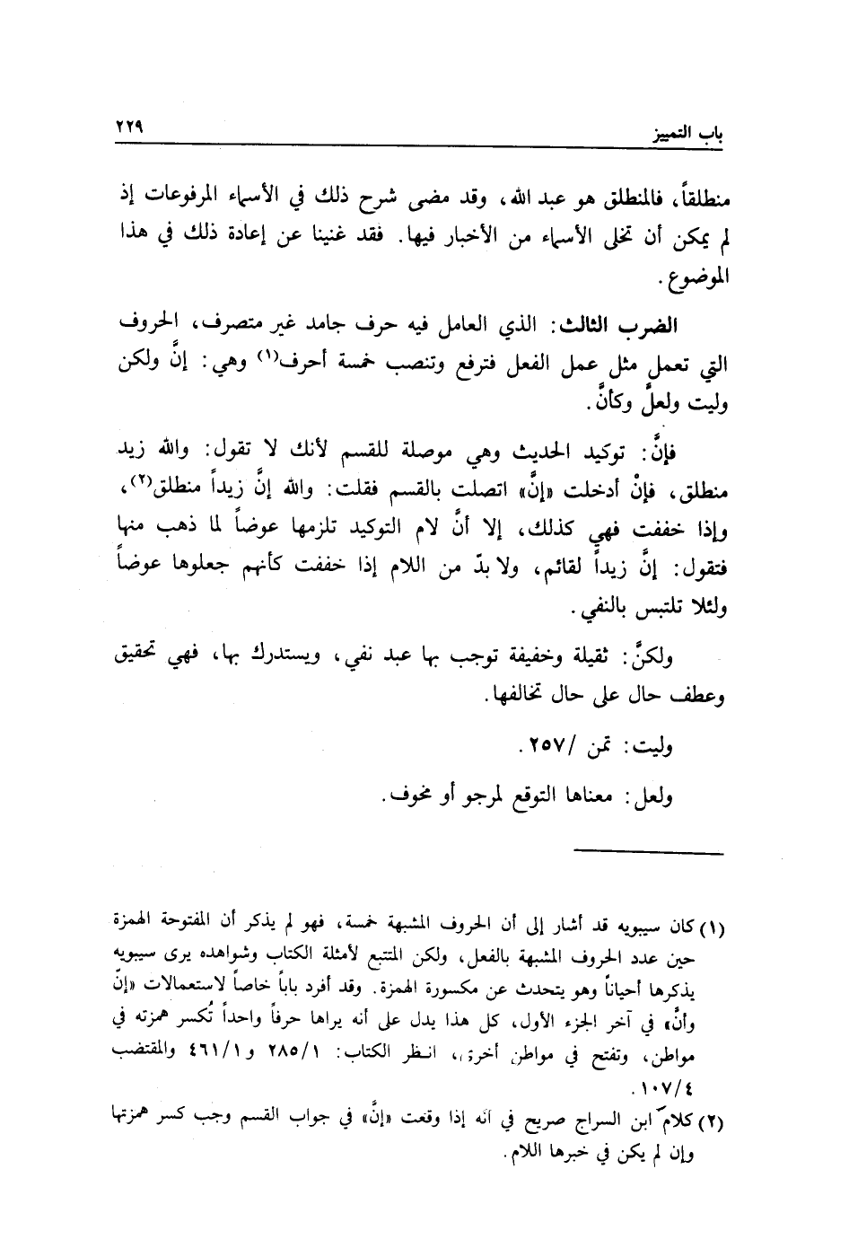 1 كان سيبويه قد أشار إلى أن الحروف المشبهة خمسة، فهو لم يذكر أن المفتوحة الهمزة حين عدد الحروف المشبهة بالفعل، ولكن المتتبع لأمثلة الكتاب وشواهده يرى سيبويه يذكرها أحيانا وهو يتحدث عن مكسورة الهمزة. وقد أفرد بابا خاصا لاستعمالات "إن وأن" في آخر الجزء الأول، كل هذا يدل على أنه يراها حرفا واحدا تكسر همزته في مواطن، وتفتح في مواطن أخرى، انظر الكتاب: 1/ 285 و1/ 461 والمقتضب 4/ 107.